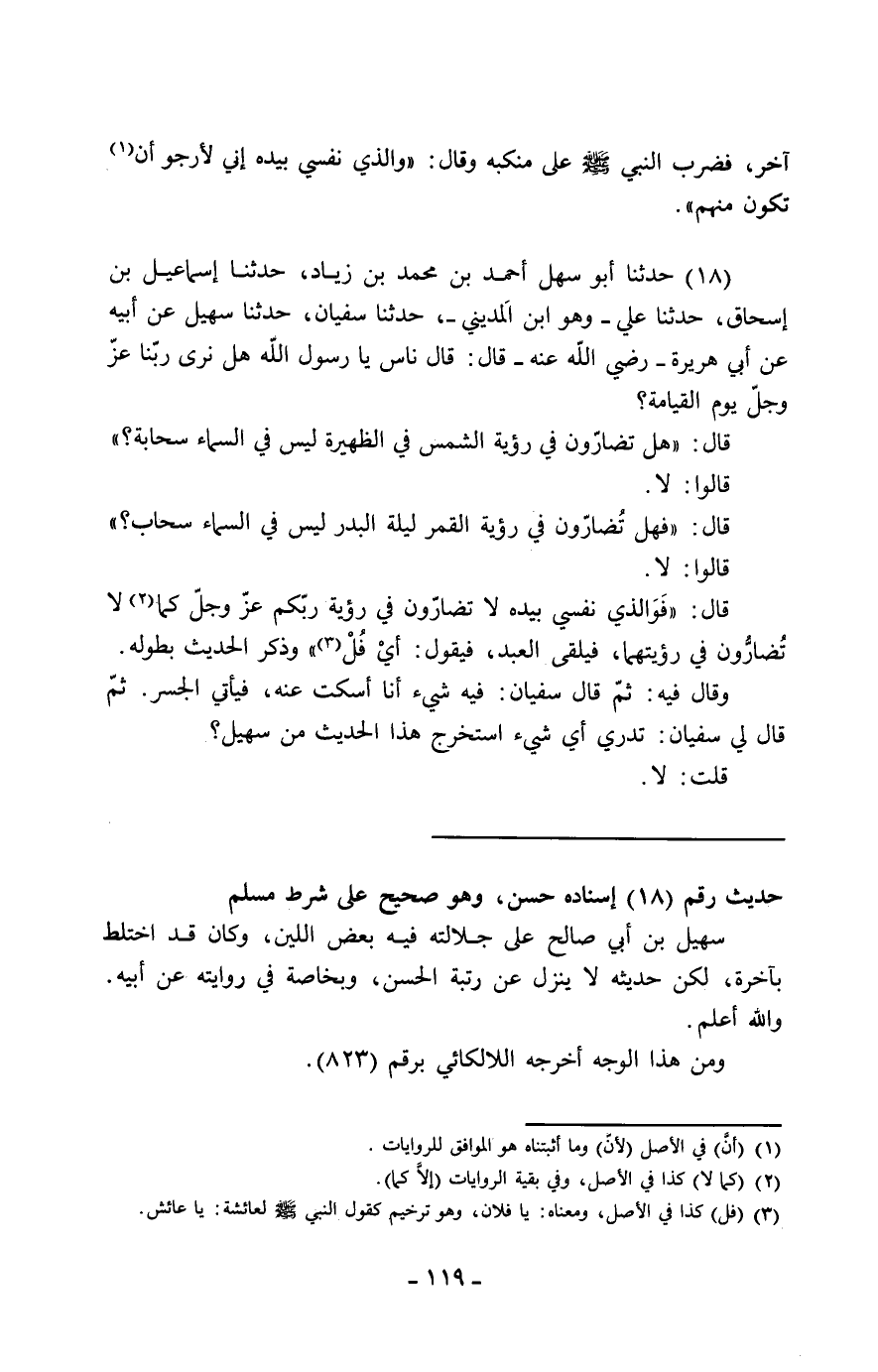 18 - حَدَّثَنَا أَبُو سَهْلٍ أَحْمَدُ بْنُ مُحَمَّدِ بْنِ زِيَادٍ، حَدَّثَنَا إِسْمَاعِيلُ بْنُ إِسْحَاقَ، حَدَّثَنَا عَلِيٌّ وَهُوَ ابْنُ الْمَدِينِيِّ، حَدَّثَنَا سُفْيَانُ، حَدَّثَنَا سُهَيْلٌ، عَنْ أَبِيهِ، عَنْ أَبِي هُرَيْرَةَ، رَضِيَ اللَّهُ عَنْهُ قَالَ: قَالَ نَاسٌ: يَا رَسُولَ اللَّهِ , هَلْ نَرَى رَبَّنَا عَزَّ وَجَلَّ يَوْمَ الْقِيَامَةِ؟ قَالَ: «§هَلْ تُضَارُّونَ فِي رُؤْيَةِ الشَّمْسِ فِي الظَّهِيرَةِ لَيْسَ فِي السَّمَاءِ سَحَابَةٌ؟» قَالُوا: لَا. قَالَ: «فَهَلْ تُضَارُّونَ فِي رُؤْيَةِ الْقَمَرِ لَيْلَةَ الْبَدْرِ لَيْسَ فِي السَّمَاءِ سَحَابٌ؟» قَالُوا: لَا. قَالَ: " فَوَالَّذِي نَفْسِي بِيَدِهِ لَا تُضَارُّونَ فِي رُؤْيَةِ رَبِّكُمْ عَزَّ وَجَلَّ كَمَا لَاتُضَارُّونَ فِي رُؤْيَتِهِمَا، فَيَلْقَى الْعَبْدَ، فَيَقُولُ: أَيْ فُلُ " وَذَكَرَ الْحَدِيثَ بِطُولِهِ. وَقَالَ فِيهِ: ثُمَّ قَالَ سُفْيَانُ: فِيهِ شَيْءٌ أَنَا أَسْكُتُ عَنْهُ، فَيَأْتِي الْجَسْرَ. ثُمَّ قَالَ لِي سُفْيَانُ: تَدْرِي أَيَّ شَيْءٍ اسْتَخْرَجَ هَذَا الْحَدِيثَ مِنْ سُهَيْلٍ؟ قُلْتُ: لَا. -[120]- قَالَ: كَانَ الْأَعْمَشُ ذَكَرَ مِنْهُ هَذِهِ الْكَلِمَةَ: «فَكُلُّ مَنْ أَنْفَقَ زَوْجًا مِمَّا يَمْلِكُ مِنَ الْمَالِ» قَالَ سُفْيَانُ: فَقُلْتُ لِسُهَيْلٍ: حَدِيثُ أَبِيكَ: «مَنْ أَنْفَقَ زَوْجًا مِنَ الْمَالِ مِمَّا يَمْلِكُ» فَقَالَ: هَذَا حَدِيثٌ طَوِيلٌ. قَالَ سُفْيَانُ: ثُمَّ سَاقَهُ لَنَا، وَرَدَّهُ سُهَيْلٌ مَرَّتَيْنِ، فَحَفِظْتُهُ فِي مَرَّتَيْنِ. قُلْتُ لِسُفْيَانَ: فَإِنَّ رَوْحَ بْنَ الْقَاسِمِ كَانَ يَرْوِيهِ بِطُولِهِ. فَقَالَ: حَفِظْتُهُ مِنْهُ، أَنَا وَرَوْحٌ جَمِيعًا. قَالَ سُفْيَانُ: أَعَادَهُ عَلَيْنَا مَرَّتَيْنِ. قَالَ سُفْيَانُ: لَمْ أَرَ رَجُلًا كَانَ دَخَلَ فِي سِنٍّ أَحْسَنَ حِفْظًا مِنْ رَوْحِ بْنِ الْقَاسِمِ. قَالَ سُفْيَانُ: جَمَعْتُ بَيْنَ رَوْحِ بْنِ الْقَاسِمِ وَبَيْنَ سُهَيْلِ بْنِ أَبِي صَالِحٍ. قَالَ سُفْيَانُ: كُنَّا نَعُدُّهُ مُثْبِتًا لِلْحَدِيثِ يَعْنِي سُهَيْلَ بْنَ أَبِي صَالِحٍ قَالَ سُفْيَانُ: كَانَ سُهَيْلٌ يَتَشَدَّدُ فِي الْحَدِيثِ وَحِفْظِهِ. قَالَ سُفْيَانُ: وَلَمْ يَكُنْ أَحَدٌ يَقْدِرُ أَنْ يَكْتُبَ عَنْهُ. قَالَ إِسْمَاعِيلُ الْقَاضِي: سَمِعْتُ عَلِيًّا يَقُولُ: سَأَلْتُ أَبَا عُبَيْدَةَ عَنْ تَرْبَعُ؟ فَقَالَ: هُوَ مِنَ الْمِرْبَاعِ يُؤَدَّى إِلَيْهِ مِثْلُ الْعُشْرِ وَالْخُمْسِ