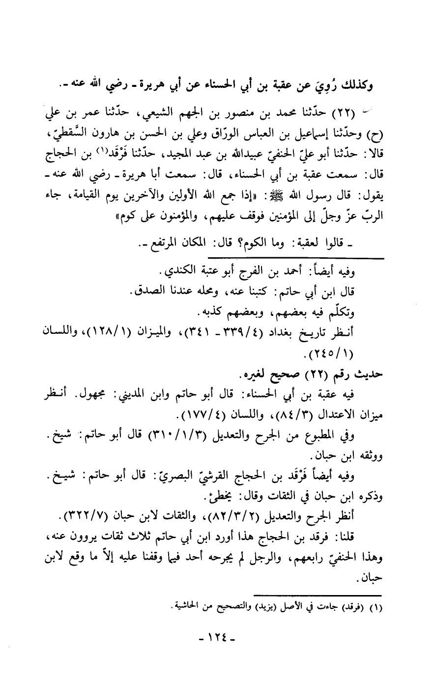 22 - حَدَّثَنَا مُحَمَّدُ بْنُ مَنْصُورِ بْنِ الْجَهْمِ الشِّيعِيُّ، حَدَّثَنَا عُمَرُ بْنُ عَلِيٍّ، ح وَحَدَّثَنَا إِسْمَاعِيلُ بْنُ الْعَبَّاسِ الْوَرَّاقُ، وَعَلِيُّ بْنُ الْحَسَنِ بْنِ هَارُونَ السَّقَطِيُّ، قَالَا: حَدَّثَنَا أَبُو عَلِيٍّ الْحَنَفِيُّ عُبَيْدُ اللَّهِ بْنُ عَبْدِ الْمَجِيدِ، حَدَّثَنَا فَرْقَدُ بْنُ الْحَجَّاجِ، قَالَ: سَمِعْتُ عُقْبَةَ بْنَ أَبِي الْحَسْنَاءِ، قَالَ: سَمِعْتُ أَبَا هُرَيْرَةَ، رَضِيَ اللَّهُ عَنْهُ يَقُولُ: قَالَ رَسُولُ اللَّهِ صَلَّى اللَّهُ عَلَيْهِ وَسَلَّمَ: «§إِذَا جَمَعَ اللَّهُ الْأَوَّلِينَ وَالْآخِرِينَ يَوْمَ الْقِيَامَةِ، جَاءَ الرَّبُّ عَزَّ وَجَلَّ إِلَى الْمُؤْمِنِينَ فَوَقَفَ عَلَيْهِمْ، وَالْمُؤْمِنُونَ عَلَى كَوْمٍ» قَالُوا لِعُقْبَةَ: وَمَا الْكَوْمُ؟ قَالَ: الْمَكَانُ الْمُرْتَفِعُ -[125]- فَيَقُولُ: هَلْ تَعْرِفُونَ رَبَّكُمْ عَزَّ وَجَلَّ؟ فَيَقُولُونَ: إِنْ عَرَّفَنَا نَفْسَهُ عَرَفْنَاهُ، فَيَقُولُ لَهُمُ الثَّانِيَةَ: هَلْ تَعْرِفُونَ رَبَّكُمْ؟ فَيَقُولُونَ: إِنْ عَرَّفَنَا نَفْسَهُ عَرَفْنَاهُ، قَالَ: فَيَتَجَلَّى لَهُمْ عَزَّ وَجَلَّ، فَيَضْحَكُ فِي وُجُوهِهِمْ، فَيَخِرُّونَ لَهُ سُجَّدًا "