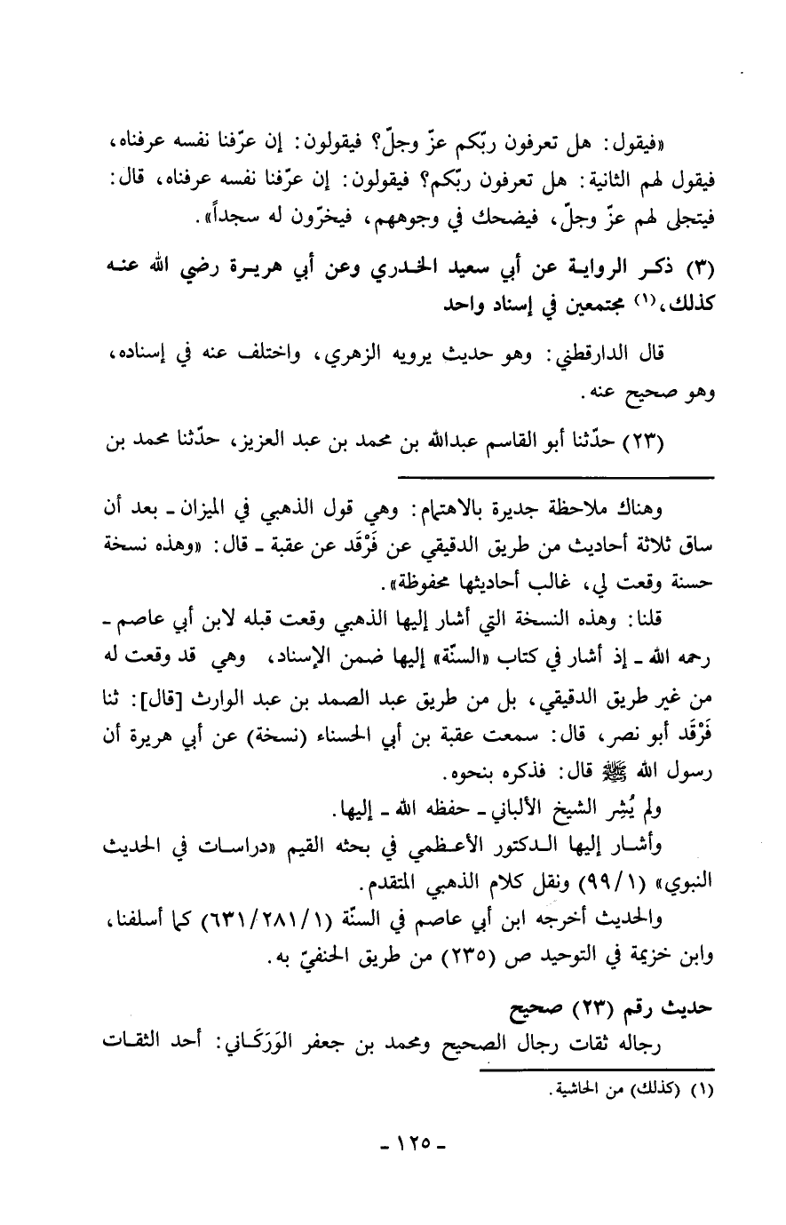 23 - حَدَّثَنَا أَبُو الْقَاسِمِ عَبْدُ اللَّهِ بْنُ مُحَمَّدِ بْنِ عَبْدِ الْعَزِيزِ، حَدَّثَنَا مُحَمَّدُ بْنُ -[126]- جَعْفَرٍ أَبُو عِمْرَانَ الْوَرْكَانِيُّ، حَدَّثَنَا إِبْرَاهِيمُ بْنُ سَعْدٍ، عَنِ ابْنِ شِهَابٍ، عَنْ عَطَاءِ بْنِ يَزِيدَ، أَنَّ أَبَا هُرَيْرَةَ، رَضِيَ اللَّهُ عَنْهُ أَخْبَرَهُ أَنَّ النَّاسَ قَالُوا: يَا رَسُولَ اللَّهِ هَلْ نَرَى رَبَّنَا عَزَّ وَجَلَّ يَوْمَ الْقِيَامَةِ؟ فَقَالَ النَّبِيُّ صَلَّى اللَّهُ عَلَيْهِ وَسَلَّمَ: «§هَلْ تُضَارُّونَ فِي رُؤْيَةِ الشَّمْسِ لَيْسَ دُونَهَا سَحَابٌ؟» قَالُوا: لَا يَا رَسُولَ اللَّهِ. قَالَ: «فَإِنَّكُمْ تَرَوْنَهُ يَوْمَ الْقِيَامَةِ كَذَلِكَ» قَالَ الدَّارَقُطْنِيُّ: هَكَذَا حَدَّثَنَا عَبْدُ اللَّهِ بْنُ مُحَمَّدٍ , عَنِ الْوَرْكَانِيِّ مُخْتَصَرًا، وَهُوَ عِنْدَهُ عَنْهُ بِطُولِهِ