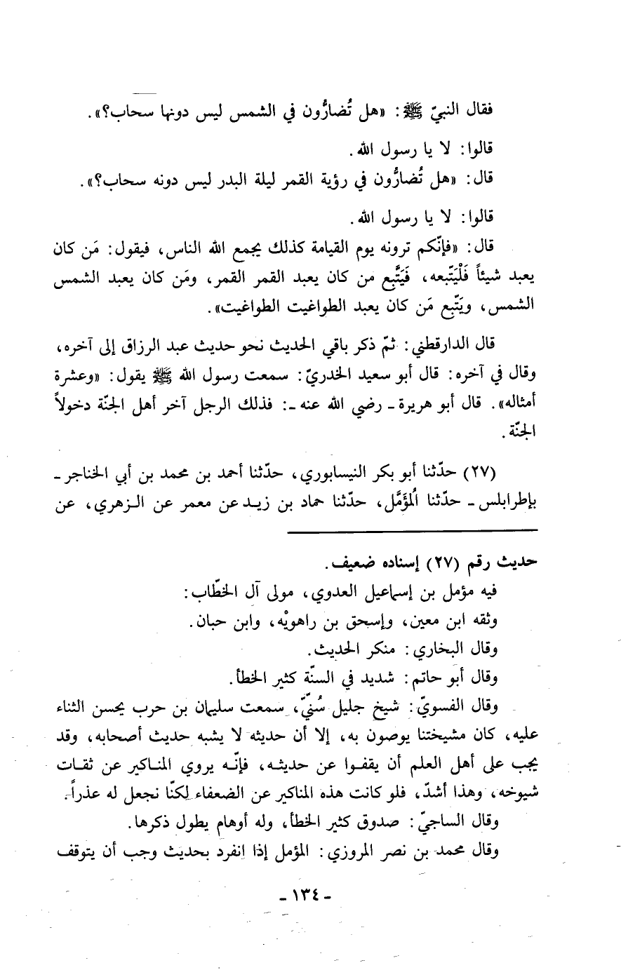 27 - حَدَّثَنَا أَبُو بَكْرٍ النَّيْسَابُورِيُّ، حَدَّثَنَا أَحْمَدُ بْنُ مُحَمَّدِ بْنِ أَبِي الْخَنَاجِرِ، بِإِطْرَابُلْسَ حَدَّثَنَا الْمُؤَمَّلُ، حَدَّثَنَا حَمَّادُ بْنُ زَيْدٍ، عَنْ مَعْمَرٍ، عَنِ الزُّهْرِيِّ، عَنْ -[135]- عَطَاءِ بْنِ يَزِيدَ اللَّيْثِيِّ، عَنْ أَبِي سَعِيدٍ الْخُدْرِيِّ، وَأَبِي هُرَيْرَةَ، رَضِيَ اللَّهُ عَنْهُ أَنَّ رَجُلًا، قَالَ: يَا رَسُولَ اللَّهِ أَكُلُّنَا يَرَى رَبَّهُ عَزَّ وَجَلَّ يَوْمَ الْقِيَامَةِ؟ فَقَالَ النَّبِيُّ صَلَّى اللَّهُ عَلَيْهِ وَسَلَّمَ: «§هَلْ تُضَارُّونَ فِي رُؤْيَةِ الشَّمْسِ فِي نِصْفِ النَّهَارِ لَيْسَ دُونَهَا سَحَابٌ؟» قَالُوا: لَا. قَالَ: «فِي رُؤْيَةِ الْقَمَرِ لَيْلَةَ الْبَدْرِ لَيْسَ دُونَهُ سَحَابٌ؟» قَالُوا: لَا. قَالَ: «فَكَذَلِكَ لَا تُضَارُّونَ فِي رُؤْيَتِهِ كَمَا لَا تُضَارُّونَ فِي رُؤْيَتِهِمَا» قَالَ الدَّارَقُطْنِيُّ: أَغْرَبَ مُؤَمَّلٌ عَنْ حَمَّادِ بْنِ زَيْدٍ فِي إِسْنَادِهِ، فَأَسْنَدَهُ عَنْ أَبِي سَعِيدٍ وَأَبِي هُرَيْرَةَ مِنْ أَوَّلِهِ، وَغَيْرُهُ يَرْوِيهِ عَنْ حَمَّادِ بْنِ زَيْدٍ، أَسْنَدَهُ عَنْ أَبِي هُرَيْرَةَ وَحْدَهُ رَضِيَ اللَّهُ عَنْهُ , وَيَذْكُرُ فِي آخِرِهِ أَبَا سَعِيدٍ