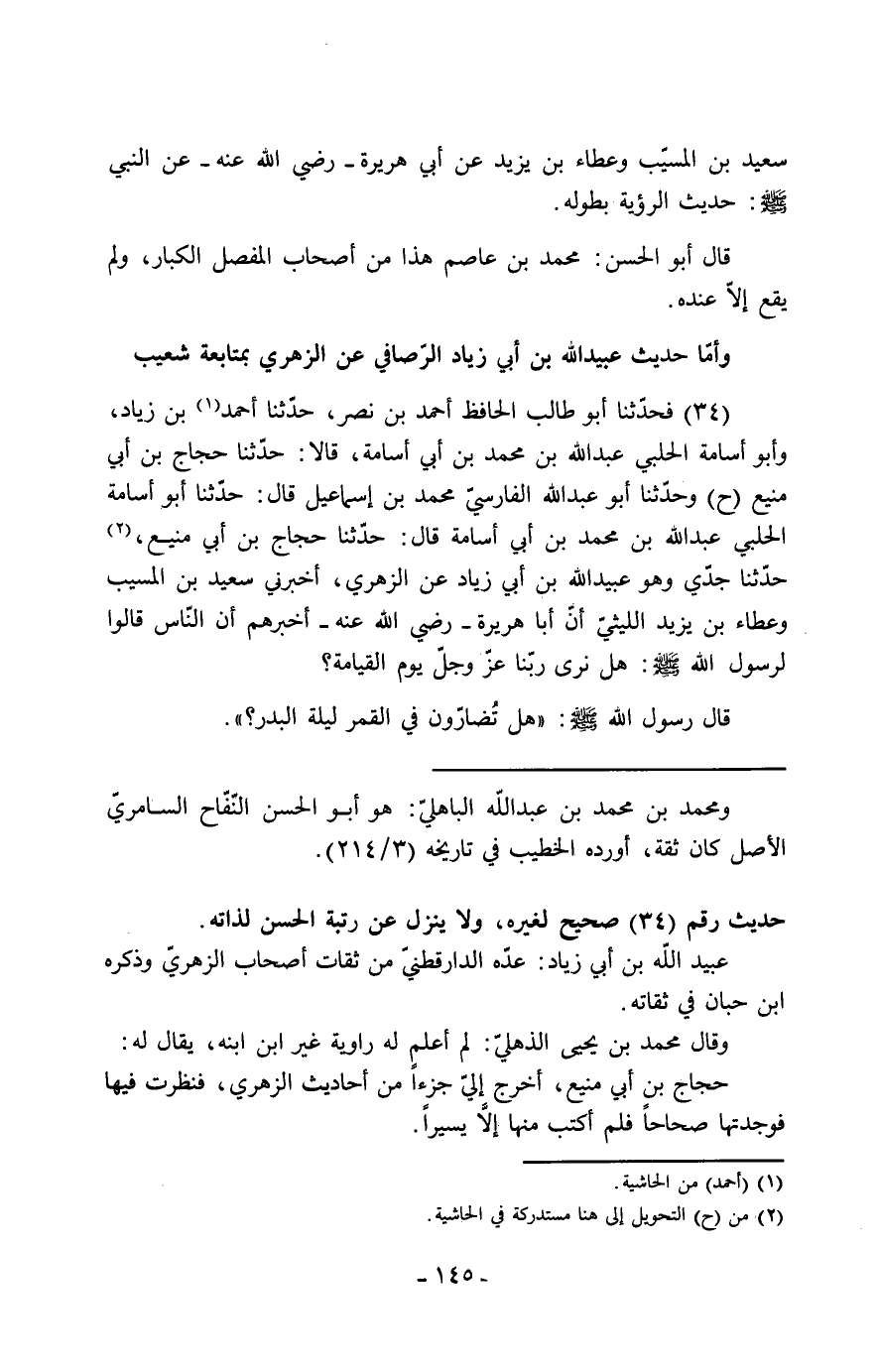 34 - فَحَدَّثَنَا أَبُو طَالِبٍ الْحَافِظُ أَحْمَدُ بْنُ نَصْرٍ، حَدَّثَنَا أَحْمَدُ بْنُ زِيَادٍ، وَأَبُو أُسَامَةَ الْحَلَبِيُّ عَبْدُ اللَّهِ بْنُ أَبِي أُسَامَةَ، قَالَا: حَدَّثَنَا حَجَّاجُ بْنُ أَبِي مَنِيعٍ، ح، وَحَدَّثَنَا أَبُو عَبْدِ اللَّهِ الْفَارِسِيُّ مُحَمَّدُ بْنُ إِسْمَاعِيلَ، قَالَ: حَدَّثَنَا أَبُو أُسَامَةَ الْحَلَبِيُّ عَبْدُ اللَّهِ بْنُ مُحَمَّدِ بْنِ أَبِي أُسَامَةَ، قَالَ: حَدَّثَنَا حَجَّاجُ بْنُ أَبِي مَنِيعٍ، حَدَّثَنَا جَدِّي وَهُوَ عُبَيْدُ اللَّهِ بْنُ أَبِي زِيَادٍ، عَنِ الزُّهْرِيِّ، أَخْبَرَنِي سَعِيدُ بْنُ الْمُسَيِّبِ، وَعَطَاءُ بْنُ يَزِيدَ اللَّيْثِيُّ , أَنَّ أَبَا هُرَيْرَةَ، رَضِيَ اللَّهُ عَنْهُ أَخْبَرَهُمْ أَنَّ النَّاسَ قَالُوا لِرَسُولِ اللَّهِ صَلَّى اللَّهُ عَلَيْهِ وَسَلَّمَ: هَلْ نَرَى رَبَّنَا عَزَّ وَجَلَّ يَوْمَ الْقِيَامَةِ؟ قَالَ رَسُولُ اللَّهِ صَلَّى اللَّهُ عَلَيْهِ وَسَلَّمَ: «§هَلْ تُضَارُّونَ فِي الْقَمَرِ لَيْلَةَ الْبَدْرِ؟» -[146]- قَالُوا: لَا يَا رَسُولَ اللَّهِ. قَالَ: «فَهَلْ تُمَارُونَ فِي الشَّمْسِ لَيْسَ دُونَهَا سَحَابٌ؟» قَالُوا: لَا يَا رَسُولَ اللَّهِ. قَالَ: " فَإِنَّكُمْ تَرَوْنَهُ عَزَّ وَجَلَّ كَذَلِكَ. يَحْشُرُ اللَّهُ النَّاسَ يَوْمَ الْقِيَامَةِ، فَيُقَالُ: مَنْ كَانَ يَعْبُدُ شَيْئًا فَلْيَتَّبِعْهُ، فَمَنْ كَانَ يَعْبُدُ الشَّمْسَ الشَّمْسَ، وَمَنْ كَانَ يَعْبُدُ الْقَمَرَ الْقَمَرَ، وَمَنْ كَانَ يَعْبُدُ الطَّوَاغِيتَ الطَّوَاغِيتَ، وَتَبْقَى هَذِهِ الْأُمَّةُ، فَيَأْتِيهِمُ اللَّهُ عَزَّ وَجَلَّ فِي غَيْرِ صُورَتِهِ، فَيَقُولُ: أَنَا رَبُّكُمْ، فَيَقُولُونَ: نَعُوذُ بِاللَّهِ مِنْكَ، هَذَا مَكَانُنَا حَتَّى يَأْتِيَنَا رَبُّنَا، فَإِذَا جَاءَ رَبُّنَا عَرَفْنَاهُ، فَيَأْتِيهِمُ اللَّهُ عَزَّ وَجَلَّ فِي صُورَتِهِ الَّتِي يَعْرِفُونَ، فَيَقُولُ: أَنَا رَبُّكُمْ، فَيَقُولُونَ أَنْتَ رَبُّنَا، فَيَدْعُوهُمْ، وَيُضْرَبُ الصِّرَاطُ بَيْنَ ظَهْرَيْ جَهَنَّمَ، فَأَكُونُ أَوَّلَ مَنْ يُجِيزُ مِنَ الرُّسُلِ بِأُمَّتِي، وَدَعْوَى الرُّسُلِ يَوْمَئِذٍ: اللَّهُمَّ سَلِّمْ، سَلِّمْ، وَفِي جَهَنَّمَ كَلَالِيبُ مِثْلُ شَوْكِ السَّعْدَانِ، هَلْ رَأَيْتُمْ شَوْكَ السَّعْدَانِ؟ غَيْرَ أَنَّهُ لَا يَعْلَمُ قَدْرَ عِظَمِهَا إِلَّا اللَّهُ عَزَّ وَجَلَّ، تَخْتَطِفُ النَّاسَ بِأَعْمَالِهِمْ، فَمِنْهُمْ مَنْ يُوبَقُ بِعَمَلِهِ، وَمِنْهُمْ مَنْ يُخَرْدَلُ ثُمَّ يَنْجُو، حَتَّى إِذَا أَرَادَ اللَّهُ عَزَّ وَجَلَّ رَحْمَةَ مَنْ أَرَادَ مِنْ أَهْلِ النَّارِ، أَمَرَ اللَّهُ الْمَلَائِكَةَ أَنْ يُخْرِجُوا مَنْ كَانَ أَوْبَقَ بِعَمَلِهِ مِمَّنْ أَرَادَ اللَّهُ أَنْ يَرْحَمَهُ مِمَّنْ يَقُولُ: لَا إِلَهَ إِلَّا اللَّهُ فَيَعْرِفُونَهُمْ فِي النَّارِ بِعَلَامَةِ أَثَرِ السُّجُودِ، وَحَرَّمَ اللَّهُ عَلَى النَّارِ أَنْ تَأْكُلَ أَثَرَ السُّجُودِ، فَيَخْرُجُونَ مِنَ النَّارِ قَدِ امْتُحِشُوا، فَيُصَبُّ عَلَيْهِمْ مَاءُ الْحَيَاةِ، فَيَنْبُتُونَ فِيهِ كَمَا تَنْبُتُ الْحَبَّةُ فِي حَمِيلِ السَّيْلِ، ثُمَّ يَفْرَغُ اللَّهُ عَزَّ وَجَلَّ مِنَ الْقَضَاءِ بَيْنَ الْعِبَادِ، وَيَبْقَى رَجُلٌ بَيْنَ الْجَنَّةِ وَالنَّارِ، وَهُوَ آخِرُ أَهْلِ الْجَنَّةِ دُخُولًا، -[147]- فَيَقُولُ: أَيْ رَبِّ، اصْرِفْ وَجْهِي عَنِ النَّارِ، فَإِنَّهُ قَدْ قَشَبَنِي رِيحُهَا، وَأَحْرَقَنِي ذَكَاؤُهَا , فَيَقُولُ اللَّهُ عَزَّ وَجَلَّ لَهُ: فَهَلْ عَسَيْتَ إِنْ فُعِلَ بِكَ ذَلِكَ أَنْ تَسْأَلَ غَيْرَ ذَلِكَ، فَيَقُولُ: أَيْ رَبِّ , إِنِّي أُعَاهِدُكَ أَنْ لَا أَسْأَلَكَ غَيْرَ ذَلِكَ، فَيُعْطِي اللَّهَ مَا شَاءَ مِنْ عَهْدٍ وَمِ