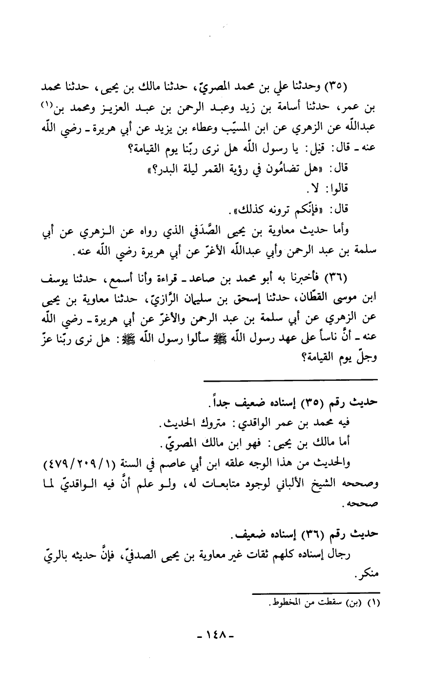 35 - وَحَدَّثَنَا عَلِيُّ بْنُ مُحَمَّدٍ الْمِصْرِيُّ، حَدَّثَنَا مَالِكُ بْنُ يَحْيَى، حَدَّثَنَا مُحَمَّدُ بْنُ عُمَرَ، حَدَّثَنَا أُسَامَةُ بْنُ زَيْدٍ، وَعَبْدُ الرَّحْمَنِ بْنُ عَبْدِ الْعَزِيزِ، وَمُحَمَّدُ بْنُ عَبْدِ اللَّهِ، عَنِ الزُّهْرِيِّ، عَنِ ابْنِ الْمُسَيِّبِ، وَعَطَاءِ بْنِ يَزِيدَ، عَنْ أَبِي هُرَيْرَةَ، رَضِيَ اللَّهُ عَنْهُ قَالَ: قِيلَ: يَا رَسُولَ اللَّهِ، هَلْ نَرَى رَبَّنَا يَوْمَ الْقِيَامَةِ؟ قَالَ: «§هَلْ تُضَامُونَ فِي رُؤْيَةِ الْقَمَرِ لَيْلَةَ الْبَدْرِ؟» قَالُوا: لَا. قَالَ: «فَإِنَّكُمْ تَرَوْنَهُ كَذَلِكَ»