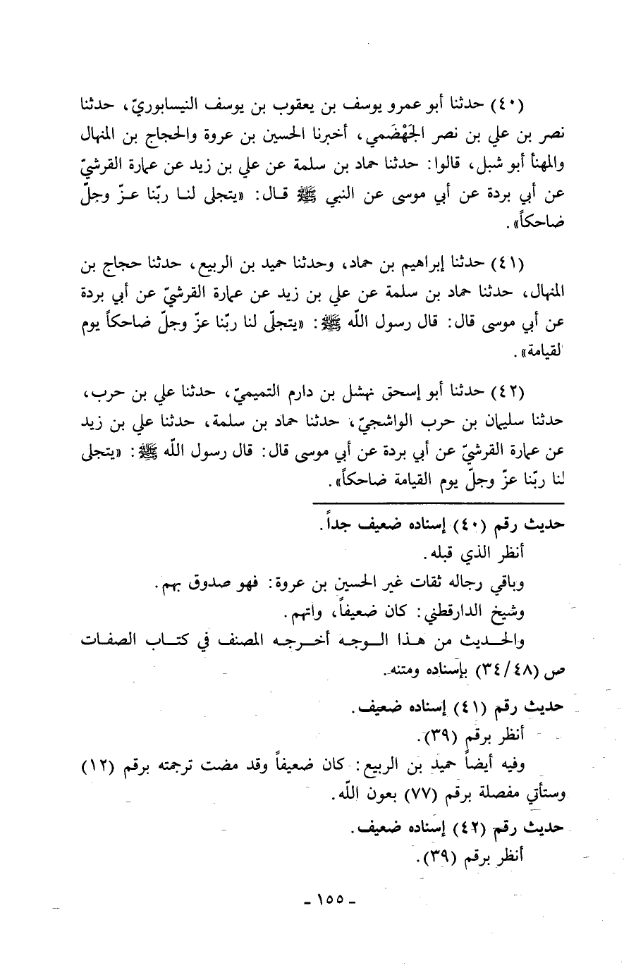 40 - حَدَّثَنَا أَبُو عَمْرٍو يُوسُفُ بْنُ يَعْقُوبَ بْنِ يُوسُفَ النَّيْسَابُورِيُّ، حَدَّثَنَا نَصْرُ بْنُ عَلِيِّ بْنِ نَصْرٍ الْجَهْضَمِيُّ، أَخْبَرَنَا الْحُسَيْنُ بْنُ عُرْوَةَ، وَالْحَجَّاجُ بْنُ الْمِنْهَالِ، وَالْمُهَنَّأُ أَبُو شِبْلٍ، قَالُوا: حَدَّثَنَا حَمَّادُ بْنُ سَلَمَةَ، عَنْ عَلِيِّ بْنِ زَيْدٍ عَنْ عُمَارَةَ الْقُرَشِيِّ، عَنْ أَبِي بُرْدَةَ، عَنْ أَبِي مُوسَى، عَنِ النَّبِيِّ صَلَّى اللَّهُ عَلَيْهِ وَسَلَّمَ قَالَ: «§يَتَجَلَّى لَنَا رَبُّنَا عَزَّ وَجَلَّ ضَاحِكًا»