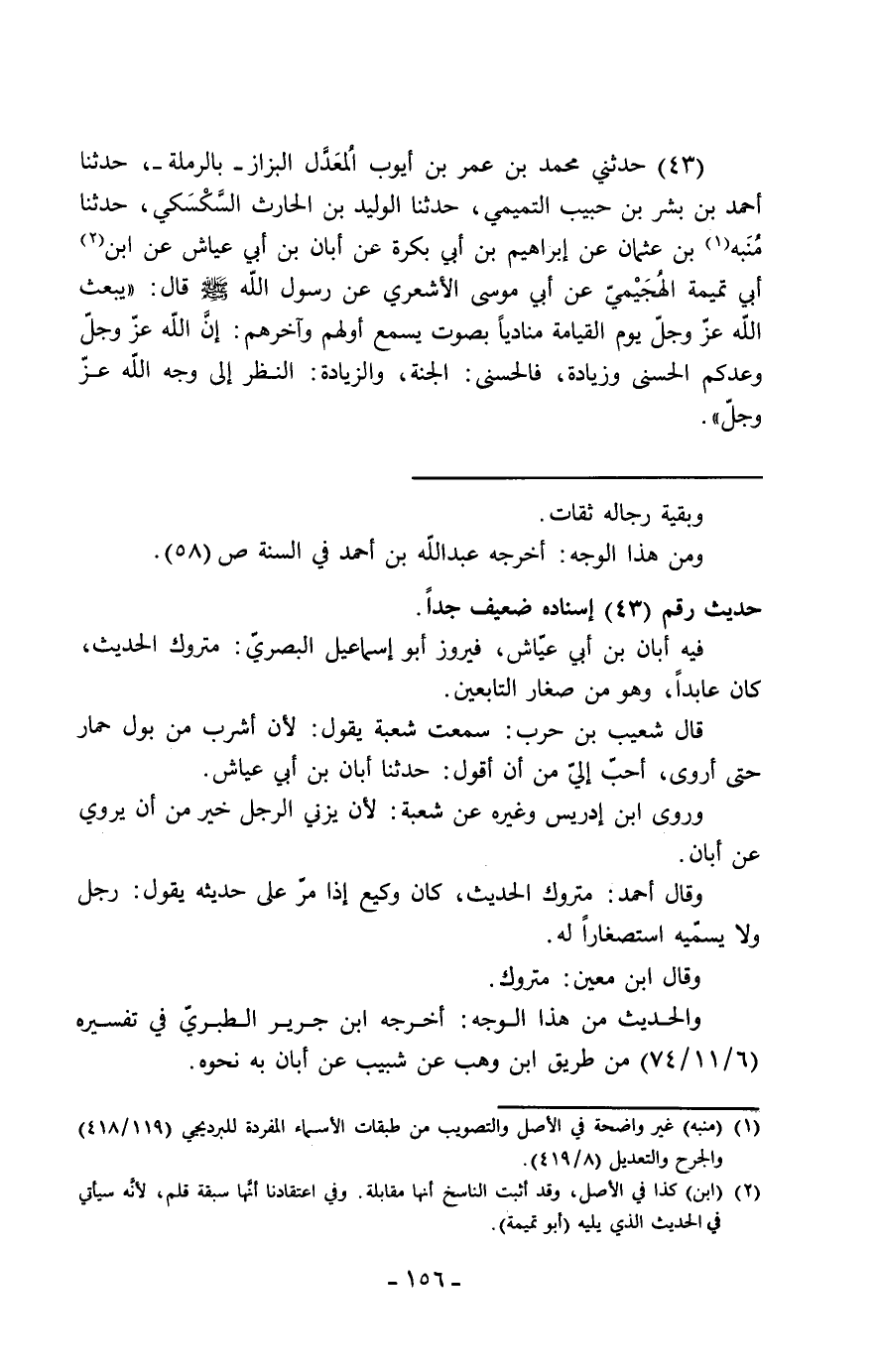 43 - حَدَّثَنِي مُحَمَّدُ بْنُ عُمَرَ بْنِ أَيُّوبَ الْمُعَدَّلُ الْبَزَّازُ، بِالرَّمْلَةِ، حَدَّثَنَا أَحْمَدُ بْنُ بِشْرِ بْنِ حَبِيبٍ التَّمِيمِيُّ، حَدَّثَنَا الْوَلِيدُ بْنُ الْحَارِثِ السَّكْسَكِيُّ، حَدَّثَنَا مُنَبِّهُ بْنُ عُثْمَانَ، عَنْ إِبْرَاهِيمَ بْنِ أَبِي بَكْرَةَ عَنْ أَبَانَ بْنِ أَبِي عَيَّاشٍ عَنِ أَبِي تَمِيمَةَ الْهُجَيْمِيِّ عَنْ أَبِي مُوسَى الْأَشْعَرِيِّ، عَنْ رَسُولِ اللَّهِ صَلَّى اللَّهُ عَلَيْهِ وَسَلَّمَ قَالَ: " §يَبْعَثُ اللَّهُ عَزَّ وَجَلَّ يَوْمَ الْقِيَامَةِ مُنَادِيًا بِصَوْتٍ يُسْمِعُ أَوَّلَهُمْ وَآخِرَهُمْ: إِنَّ اللهَ عَزَّ وَجَلَّ وَعَدَكُمُ الْحُسْنَى وَزِيَادَةً، فَالْحُسْنَى: الْجَنَّةُ، وَالزِّيَادَةُ: النَّظَرُ إِلَى وَجْهِ اللَّهِ عَزَّ وَجَلَّ "