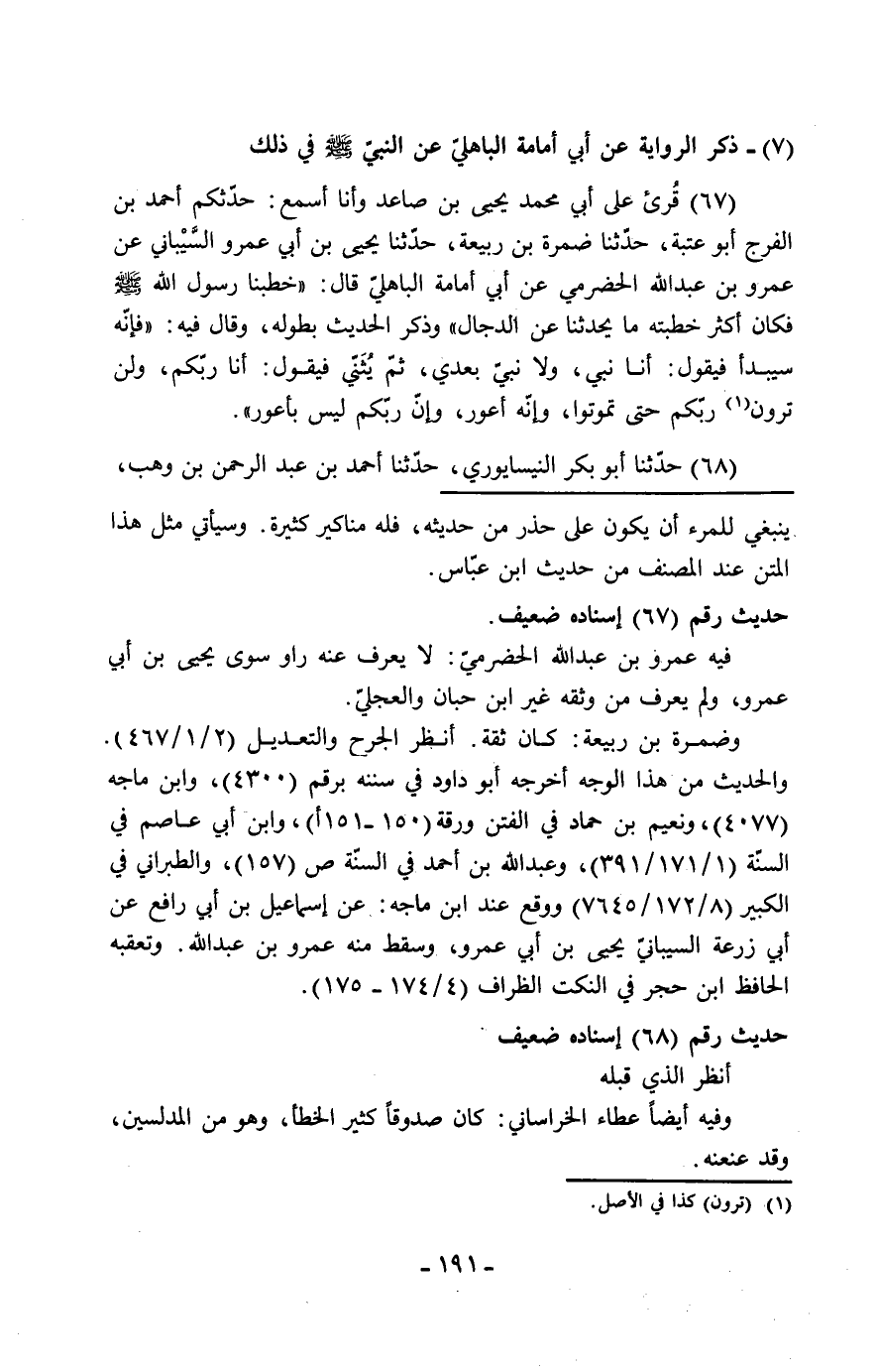 67 - قُرِئَ عَلَى أَبِي مُحَمَّدٍ يَحْيَى بْنِ صَاعِدٍ، وَأَنَا أَسْمَعُ حَدَّثَكُمْ أَحْمَدُ بْنُ الْفَرَجِ أَبُو عُتْبَةَ، حَدَّثَنَا ضَمْرَةُ بْنُ رَبِيعَةَ، حَدَّثَنَا يَحْيَى بْنُ أَبِي عَمْرٍو السَّيْبَانِيُّ، عَنْ عَمْرِو بْنِ عَبْدِ اللَّهِ الْحَضْرَمِيِّ، عَنْ أَبِي أُمَامَةَ الْبَاهِلِيِّ، قَالَ: خَطَبَنَا رَسُولُ اللَّهِ صَلَّى اللَّهُ عَلَيْهِ وَسَلَّمَ فَكَانَ أَكْثَرُ خُطْبَتِهِ مَا يُحَدِّثُنَا عَنِ الدَّجَّالِ، وَذَكَرَ الْحَدِيثَ بِطُولِهِ، وَقَالَ فِيهِ: " فَإِنَّهُ §سَيَبْدَأُ فَيَقُولُ: أَنَا نَبِيٌّ، وَلَا نَبِيَّ بَعْدِي، ثُمَّ يُثَنِّي فَيَقُولُ: أَنَا رَبُّكُمْ، وَلَنْ تَرَوْنَ رَبَّكُمْ حَتَّى تَمُوتُوا، وَإِنَّهُ أَعْوَرُ، وَإِنَّ رَبَّكُمْ لَيْسَ بِأَعْوَرَ "