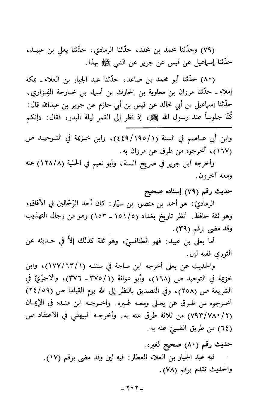 80 - حَدَّثَنَا أَبُو مُحَمَّدِ بْنُ صَاعِدٍ، حَدَّثَنَا عَبْدُ الْجَبَّارِ بْنُ الْعَلَاءِ، بِمَكَّةَ إِمْلَاءً حَدَّثَنَا مَرْوَانُ بْنُ مُعَاوِيَةَ بْنُ الْحَارِثِ بْنِ أَسْمَاءَ بْنِ خَارِجَةَ الْفَزَارِيُّ، حَدَّثَنَا إِسْمَاعِيلُ بْنُ أَبِي خَالِدٍ، عَنْ قَيْسِ بْنِ أَبِي حَازِمٍ، عَنْ جَرِيرِ بْنِ عَبْدِ اللَّهِ، قَالَ: كُنَّا جُلُوسًا عِنْدَ رَسُولِ اللَّهِ صَلَّى اللَّهُ عَلَيْهِ وَسَلَّمَ، إِذْ نَظَرَ إِلَى الْقَمَرِ لَيْلَةَ الْبَدْرِ، فَقَالَ: «إِنَّكُمْ -[203]- §سَتَرَوْنَ رَبَّكُمْ عَزَّ وَجَلَّ كَمَا تَرَوْنَ هَذَا الْقَمَرَ لَا تُضَامُونَ فِي رُؤْيَتِهِ، فَإِنِ اسْتَطَعْتُمْ أَنْ لَا تُغْلَبُوا عَلَى صَلَاةٍ» يَقُولُ إِسْمَاعِيلُ: لَا يَفُوتَنَّكُمْ قَبْلَ طُلُوعِ الشَّمْسِ وَقَبْلَ غُرُوبِهَا، ثُمَّ قَرَأَ " {وَسَبِّحْ بِحَمْدِ رَبِّكَ قَبْلَ طُلُوعِ الشَّمْسِ وَقَبْلَ الْغُرُوبِ} [ق: 39] "