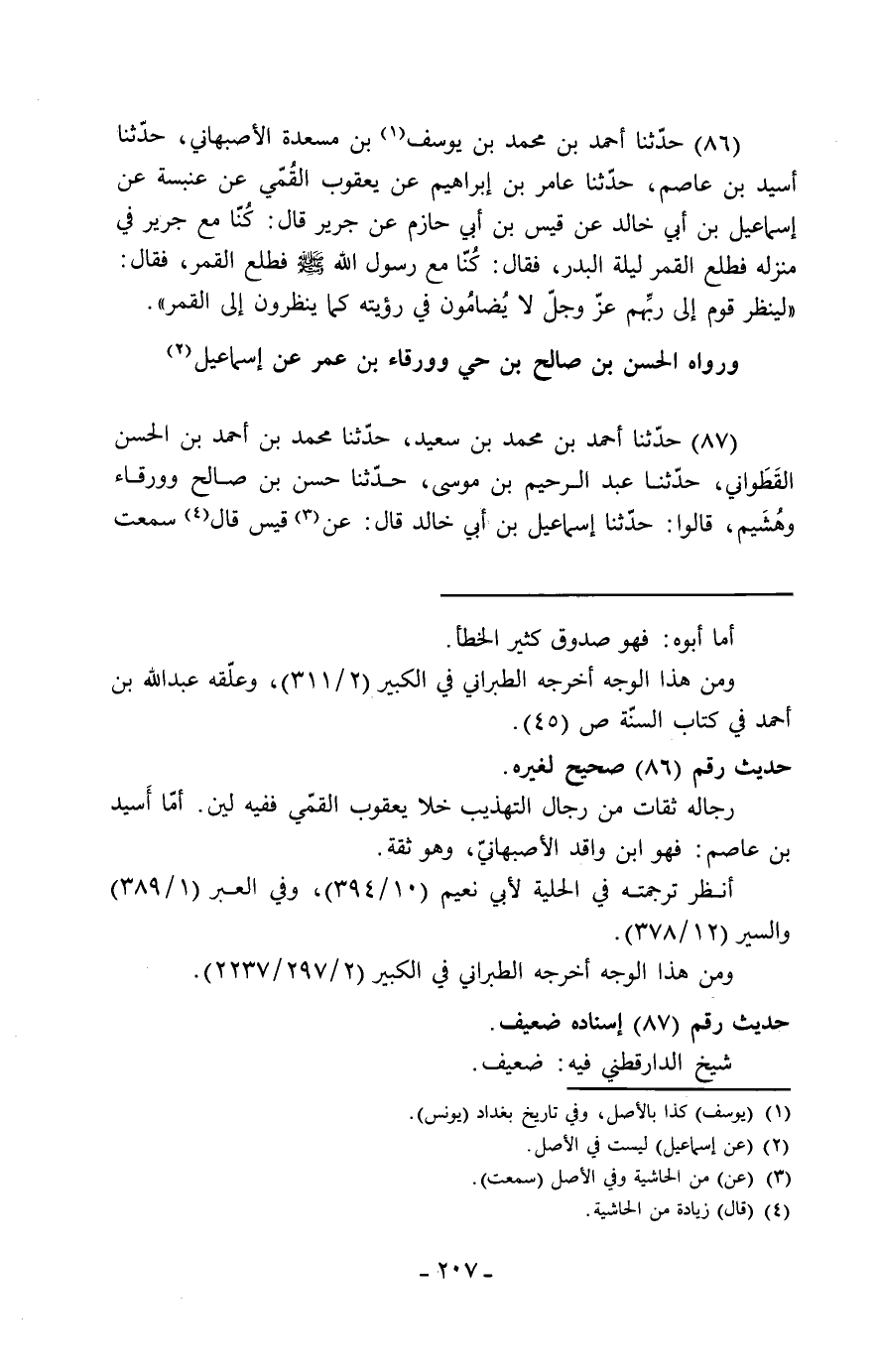 87 - حَدَّثَنَا أَحْمَدُ بْنُ مُحَمَّدِ بْنِ سَعِيدٍ، حَدَّثَنَا مُحَمَّدُ بْنُ أَحْمَدَ بْنِ الْحَسَنِ الْقَطَوَانِيُّ، حَدَّثَنَا عَبْدُ الرَّحِيمِ بْنُ مُوسَى، حَدَّثَنَا حَسَنُ بْنُ صَالِحٍ، وَوَرْقَاءُ، وَهُشَيْمٌ، قَالُوا: حَدَّثَنَا إِسْمَاعِيلُ بْنُ أَبِي خَالِدٍ، قَالَ: عَنْ قَيْسٍ، قَالَ سَمِعْتُ -[208]- جَرِيرًا، يَقُولُ: كُنَّا عِنْدَ النَّبِيِّ صَلَّى اللَّهُ عَلَيْهِ وَسَلَّمَ فَنَظَرَ إِلَى الْقَمَرِ لَيْلَةَ الْبَدْرِ فَقَالَ: «إِنَّكُمْ §سَتَرَوْنَ رَبَّكُمْ يَوْمَ الْقِيَامَةِ عِيَانًا كَمَا تَرَوْنَ هَذَا الْقَمَرَ لَا تُضَامُونَ فِي رُؤْيَتِهِ» وَرَوَاهُ عَمَّارُ بْنُ رُزَيْقٍ، وَأَبُوالْأَغَرِّ سَعِيدُ بْنُ عَبْدِ اللَّهِ، وَنَصَرُ بْنُ طَرِيفٍ أَبُو جُزَيٍّ، وَعَمَّارُ بْنُ مُحَمَّدٍ عَنْ إِسْمَاعِيلَ