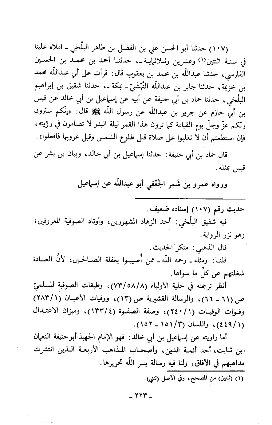 107 - حَدَّثَنَا أَبُو الْحَسَنِ عَلِيُّ بْنُ الْفَضْلِ بْنِ طَاهِرٍ الْبَلْخِيُّ، أَمْلَاهُ عَلَيْنَا فِي سَنَةِ اثْنَتَيْنِ وَعِشْرِينَ وَثَلَاثِمِائَةٍ، حَدَّثَنَا أَحْمَدُ بْنُ مُحَمَّدِ بْنِ الْحُسَيْنِ الْفَارِسِيُّ، حَدَّثَنَا عَبْدُ اللَّهِ بْنُ مُحَمَّدِ بْنِ يَعْقُوبَ قَالَ: قَرَأْتُ عَلَى أَبِي عَبْدِ اللَّهِ مُحَمَّدِ بْنِ خُزَيْمَةَ، حَدَّثَنَا جَابِرُ بْنُ عَبْدِ اللَّهِ النَّهْشَلِيُّ بِمَكَّةَ، حَدَّثَنَا شَقِيقُ بْنُ إِبْرَاهِيمَ الْبَلْخِيُّ، حَدَّثَنَا حَمَّادُ بْنُ أَبِي حَنِيفَةَ، عَنْ أَبِيهِ، عَنْ إِسْمَاعِيلَ بْنِ أَبِي خَالِدٍ، عَنْ قَيْسِ بْنِ أَبِي حَازِمٍ، عَنْ جَرِيرِ بْنِ عَبْدِ اللَّهِ، عَنْ رَسُولِ اللَّهِ صَلَّى اللَّهُ عَلَيْهِ وَسَلَّمَ قَالَ: «إِنَّكُمْ §سَتَرَوْنَ رَبَّكُمْ عَزَّ وَجَلَّ يَوْمَ الْقِيَامَةِ كَمَا تَرَوْنَ هَذَا الْقَمَرَ لَيْلَةَ الْبَدْرِ لَا تُضَامُونَ فِي رُؤْيَتِهِ، فَإِنِ اسْتَطَعْتُمْ أَنْ لَا تُغْلَبُوا عَلَى صَلَاةٍ قَبْلَ طُلُوعِ الشَّمْسِ وَقَبْلَ غُرُوبِهَا فَافْعَلُوا» قَالَ حَمَّادُ بْنُ أَبِي حَنِيفَةَ: حَدَّثَنَا إِسْمَاعِيلُ بْنُ أَبِي خَالِدٍ، وَبَيَانُ بْنُ بِشْرٍ، عَنْ قَيْسٍ بِمِثْلِهِ