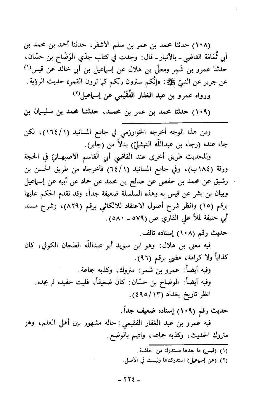 108 - حَدَّثَنَا مُحَمَّدُ بْنُ عُمَرَ بْنِ سَلْمٍ الْأَشْقَرُ، حَدَّثَنَا أَحْمَدُ بْنُ مُحَمَّدِ بْنِ أَبِي ثُمَامَةَ الْقَاضِي، بِالْأَنْبَارِ قَالَ: وَجَدْتُ فِي كِتَابِ جَدِّيَ الْوَضَّاحِ بْنِ حَسَّانَ، حَدَّثَنَا عَمْرُو بْنُ شَمِرٍ، وَمُعَلَّى بْنُ هِلَالٍ، عَنْ إِسْمَاعِيلَ بْنِ أَبِي خَالِدٍ، عَنْ قَيْسٍ، عَنْ جَرِيرٍ، عَنِ النَّبِيِّ صَلَّى اللَّهُ عَلَيْهِ وَسَلَّمَ: «إِنَّكُمْ §سَتَرَوْنَ رَبَّكُمْ كَمَا تَرَوْنَ الْقَمَرَ» حَدِيثُ الرُّؤْيَةِ. وَرَوَاهُ عَمْرُو بْنُ عَبْدِ الْغَفَّارِ الْفُقَيْمِيُّ، عَنْ إِسْمَاعِيلَ،