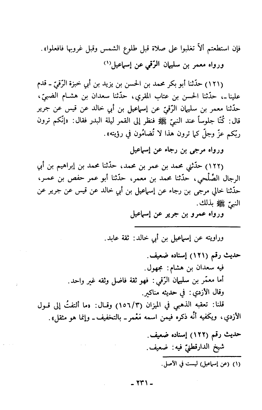 121 - حَدَّثَنَا أَبُو بَكْرٍ مُحَمَّدُ بْنُ الْحَسَنِ بْنِ يَزِيدَ بْنِ أَبِي خُبْزَةَ الرَّقِّيُّ، قُدِّمَ عَلَيْنَا، حَدَّثَنَا الْحَسَنُ بْنُ عَتَّابٍ الْمُقْرِئُ، حَدَّثَنَا سَعْدَانُ بْنُ هِشَامٍ الضَّبِّيُّ، حَدَّثَنَا مَعْمَرُ بْنُ سُلَيْمَانَ الرَّقِّيُّ، عَنْ إِسْمَاعِيلَ بْنِ أَبِي خَالِدٍ، عَنْ قَيْسٍ، عَنْ جَرِيرٍ، قَالَ: كُنَّا جُلُوسًا عِنْدَ النَّبِيِّ صَلَّى اللَّهُ عَلَيْهِ وَسَلَّمَ فَنَظَرَ إِلَى الْقَمَرِ لَيْلَةَ الْبَدْرِ فَقَالَ: «إِنَّكُمْ §تَرَوْنَ رَبَّكُمْ عَزَّ وَجَلَّ كَمَا تَرَوْنَ هَذَا لَا تُضَامُونَ فِي رُؤْيَتِهِ» وَرَوَاهُ مُرَجَّى بْنُ رَجَاءٍ عَنْ إِسْمَاعِيلَ