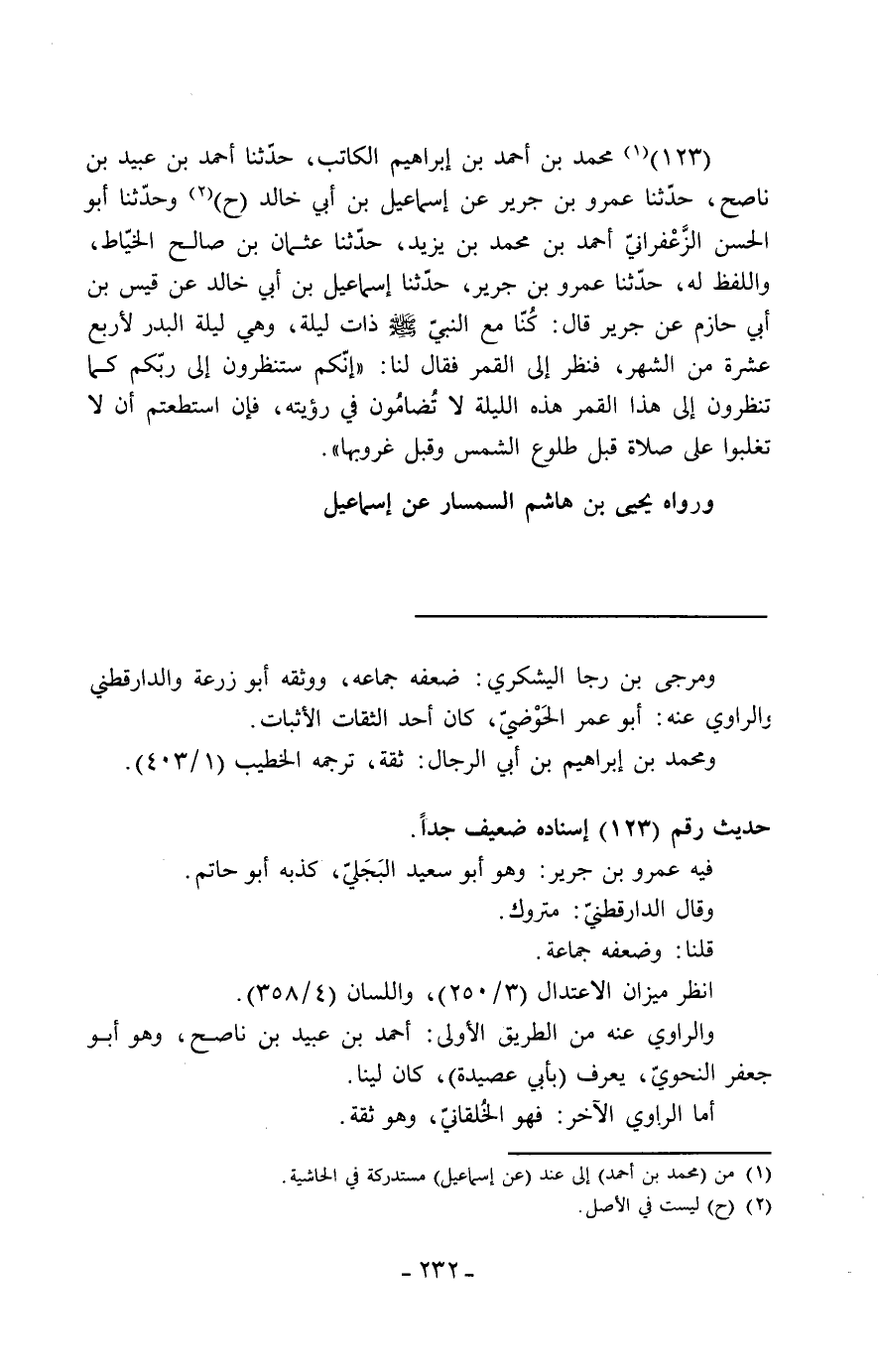 123 - مُحَمَّدُ بْنُ أَحْمَدَ بْنِ إِبْرَاهِيمَ الْكَاتِبُ، حَدَّثَنَا أَحْمَدُ بْنُ عُبَيْدِ بْنِ نَاصِحٍ، حَدَّثَنَا عَمْرُو بْنُ جَرِيرٍ، عَنْ إِسْمَاعِيلَ بْنِ أَبِي خَالِدٍ، ح، وَحَدَّثَنَا أَبُو الْحَسَنِ الزَّعْفَرَانِيُّ أَحْمَدُ بْنُ مُحَمَّدِ بْنِ يَزِيدَ، حَدَّثَنَا عُثْمَانُ بْنُ صَالِحٍ الْخَيَّاطُ، وَاللَّفْظُ لَهُ، حَدَّثَنَا عَمْرُو بْنُ جَرِيرٍ، حَدَّثَنَا إِسْمَاعِيلُ بْنُ أَبِي خَالِدٍ، عَنْ قَيْسِ بْنِ أَبِي حَازِمٍ، عَنْ جَرِيرٍ، قَالَ: كُنَّا مَعَ النَّبِيِّ صَلَّى اللَّهُ عَلَيْهِ وَسَلَّمَ، ذَاتَ لَيْلَةٍ، وَهِيَ لَيْلَةُ الْبَدْرِ لِأَرْبَعَ عَشْرَةَ مِنَ الشَّهْرِ، فَنَظَرَ إِلَى الْقَمَرِ فَقَالَ لَنَا: «إِنَّكُمْ §سَتَنْظُرُونَ إِلَى رَبِّكُمْ كَمَا تَنْظُرُونَ إِلَى هَذَا الْقَمَرِ هَذِهِ اللَّيْلَةَ لَا تُضَامُونَ فِي رُؤْيَتِهِ، فَإِنِ اسْتَطَعْتُمْ أَنْ لَا تُغْلَبُوا عَلَى صَلَاةٍ قَبْلَ طُلُوعِ الشَّمْسِ وَقَبْلَ غُرُوبِهَا» وَرَوَاهُ يَحْيَى بْنُ هَاشِمٍ السِّمْسَارُ عَنْ إِسْمَاعِيلَ -[233]-