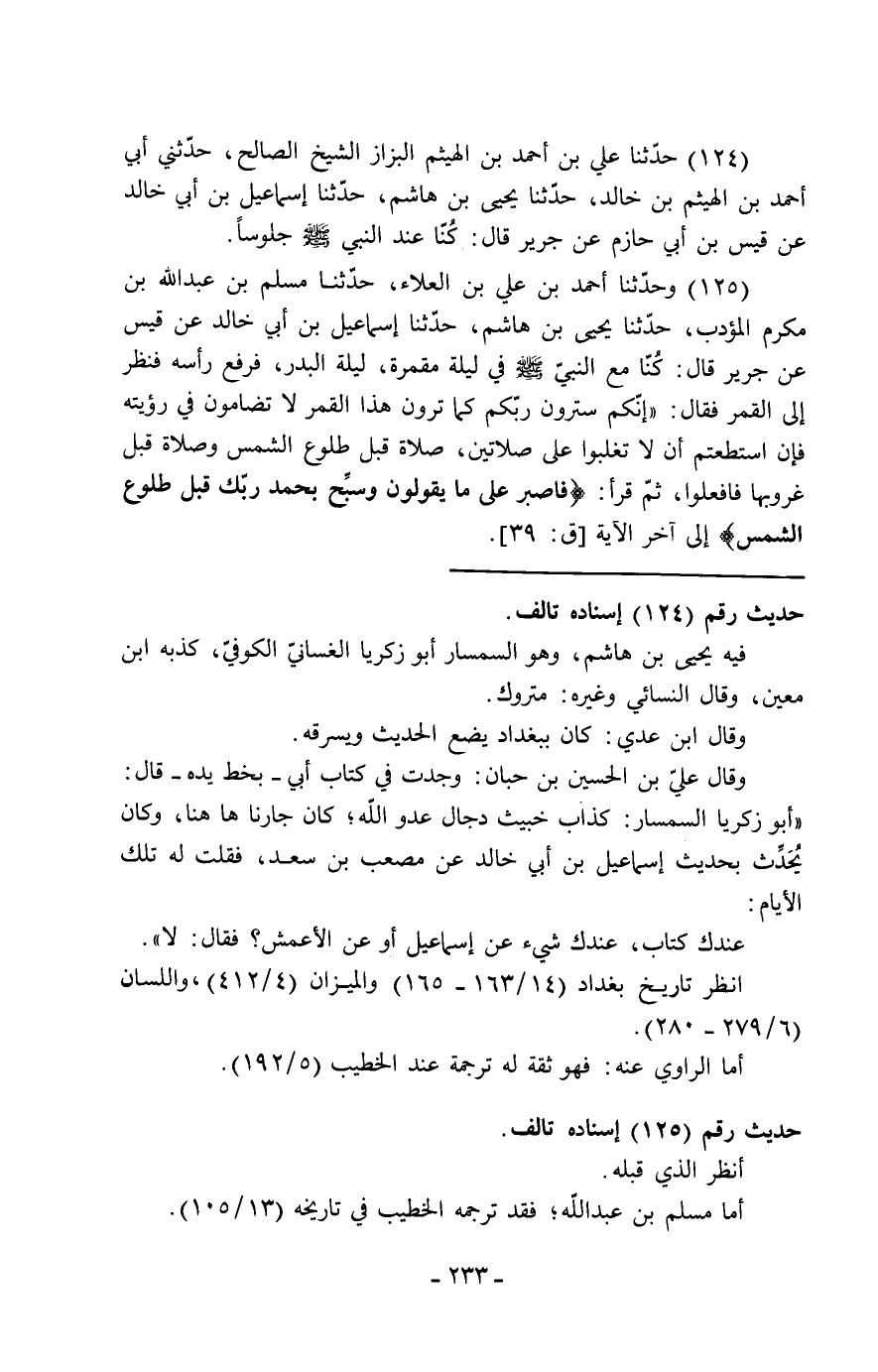 125 - وَحَدَّثَنَا أَحْمَدُ بْنُ عَلِيِّ بْنِ الْعَلَاءِ، حَدَّثَنَا مُسْلِمُ بْنُ عَبْدِ اللَّهِ بْنِ مُكْرَمٍ الْمُؤَدِّبُ، حَدَّثَنَا يَحْيَى بْنُ هَاشِمٍ، حَدَّثَنَا إِسْمَاعِيلُ بْنُ أَبِي خَالِدٍ، عَنْ قَيْسٍ، عَنْ جَرِيرٍ، قَالَ: كُنَّا مَعَ النَّبِيِّ صَلَّى اللَّهُ عَلَيْهِ وَسَلَّمَ فِي لَيْلَةٍ مُقْمِرَةٍ لَيْلَةِ الْبَدْرِ فَرَفَعَ رَأْسَهُ فَنَظَرَ إِلَى الْقَمَرِ فَقَالَ: " إِنَّكُمْ §سَتَرَوْنَ رَبَّكُمْ كَمَا تَرَوْنَ هَذَا الْقَمَرَ لَا تُضَامُونَ فِي رُؤْيَتِهِ فَإِنِ اسْتَطَعْتُمْ أَنْ لَا تُغْلَبُوا عَلَى صَلَاتَيْنِ، صَلَاةٍ قَبْلَ طُلُوعِ الشَّمْسِ وَصَلَاةٍ قَبْلَ غُرُوبِهَا فَافْعَلُوا - ثُمَّ قَرَأَ: {فَاصْبِرْ عَلَى مَا يَقُولُونَ وَسَبِّحْ بِحَمْدِ رَبِّكَ قَبْلَ طُلُوعِ الشَّمْسِ} [ق: 39] " -[234]- وَرَوَاهُ إِبْرَاهِيمُ بْنُ طَهْمَانَ عَنْ إِسْمَاعِيلَ بْنِ أَبِي خَالِدٍ