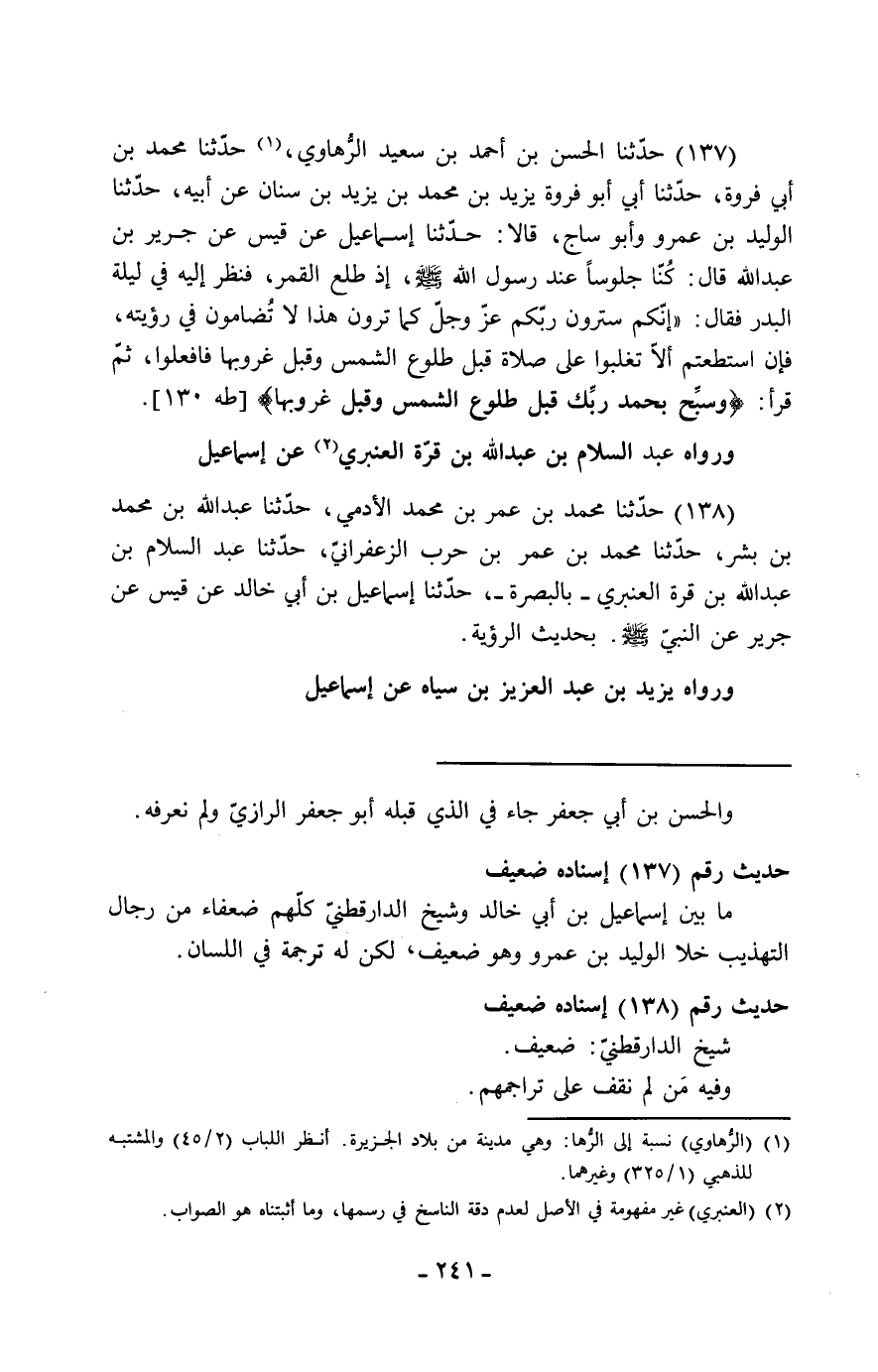 138 - حَدَّثَنَا مُحَمَّدُ بْنُ عُمَرَ بْنِ مُحَمَّدٍ الْآدَمِيُّ، حَدَّثَنَا عَبْدُ اللَّهِ بْنُ مُحَمَّدِ بْنِ بِشْرٍ، حَدَّثَنَا مُحَمَّدُ بْنُ عُمَرَ بْنِ حَرْبٍ الزَّعْفَرَانِيُّ، حَدَّثَنَا عَبْدُ السَّلَامِ بْنُ عَبْدِ اللَّهِ بْنِ قُرَّةَ الْعَنْبَرِيُّ، بِالْبَصْرَةِ، حَدَّثَنَا إِسْمَاعِيلُ بْنُ أَبِي خَالِدٍ، عَنْ قَيْسٍ، عَنْ جَرِيرٍ، عَنِ النَّبِيِّ صَلَّى اللَّهُ عَلَيْهِ وَسَلَّمَ، بِحَدِيثِ الرُّؤْيَةِ وَرَوَاهُ يَزِيدُ بْنُ عَبْدِ الْعَزِيزِ بْنِ سِيَاهٍ عَنْ إِسْمَاعِيلَ -[242]-
