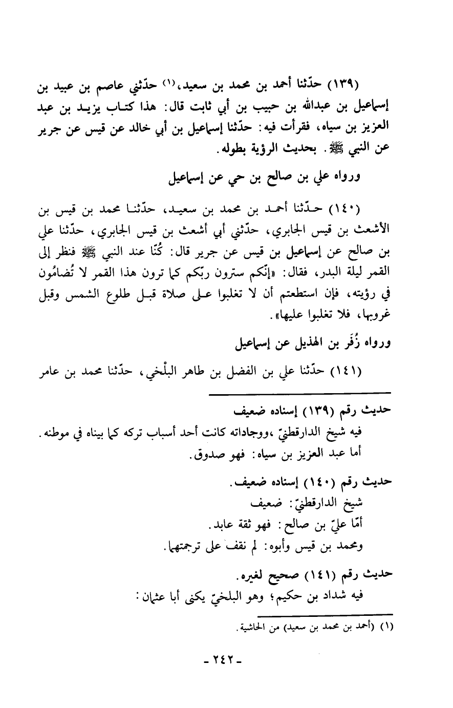 140 - حَدَّثَنَا أَحْمَدُ بْنُ مُحَمَّدِ بْنِ سَعِيدٍ، حَدَّثَنَا مُحَمَّدُ بْنُ قَيْسِ بْنِ الْأَشْعَثِ بْنِ قَيْسٍ الْجَابِرِيُّ، حَدَّثَنِي أَبِي أَشْعَثُ بْنُ قَيْسٍ الْجَابِرِيُّ، حَدَّثَنَا عَلِيُّ بْنُ صَالِحٍ، عَنْ إِسْمَاعِيلَ عَنْ قَيْسٍ، عَنْ جَرِيرٍ، قَالَ: كُنَّا عِنْدَ النَّبِيِّ صَلَّى اللَّهُ عَلَيْهِ وَسَلَّمَ، فَنَظَرَ إِلَى الْقَمَرِ لَيْلَةَ الْبَدْرِ، فَقَالَ: «إِنَّكُمْ §سَتَرَوْنَ رَبَّكُمْ كَمَا تَرَوْنَ هَذَا الْقَمَرَ لَا تُضَامُونَ فِي رُؤْيَتِهِ، فَإِنِ اسْتَطَعْتُمْ أَنْ لَا تُغْلَبُوا عَلَى صَلَاةٍ قَبْلَ طُلُوعِ الشَّمْسِ وَقَبْلَ غُرُوبِهَا، فَلَا تُغْلَبُوا عَلَيْهَا»