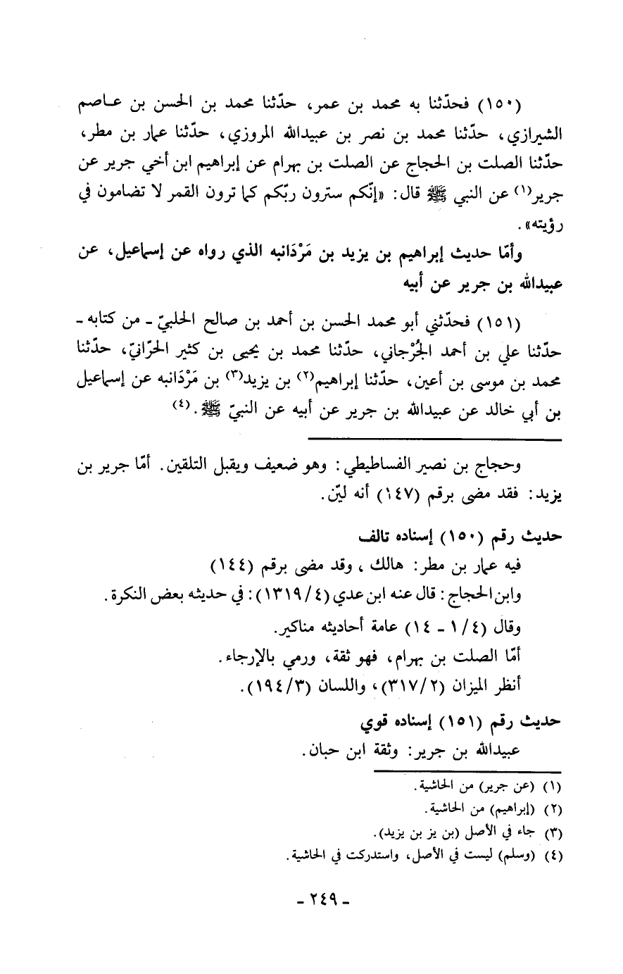 150 - فَحَدَّثَنَا بِهِ مُحَمَّدُ بْنُ عُمَرَ، حَدَّثَنَا مُحَمَّدُ بْنُ الْحَسَنِ بْنِ عَاصِمٍ الشِّيرَازِيُّ، حَدَّثَنَا مُحَمَّدُ بْنُ نَصْرِ بْنِ عُبَيْدِ اللَّهِ الْمَرْوَزِيُّ، حَدَّثَنَا عَمَّارُ بْنُ مَطَرٍ، حَدَّثَنَا الصَّلْتُ بْنُ الْحَجَّاجِ، عَنِ الصَّلْتِ بْنِ بَهْرَامَ، عَنْ إِبْرَاهِيمَ ابْنِ أَخِي جَرِيرٍ، عَنْ جَرِيرٍ، عَنِ النَّبِيِّ صَلَّى اللَّهُ عَلَيْهِ وَسَلَّمَ قَالَ: «إِنَّكُمْ §سَتَرَوْنَ رَبَّكُمْ كَمَا تَرَوْنَ الْقَمَرَ لَا تُضَامُونَ فِي رُؤْيَتِهِ»
