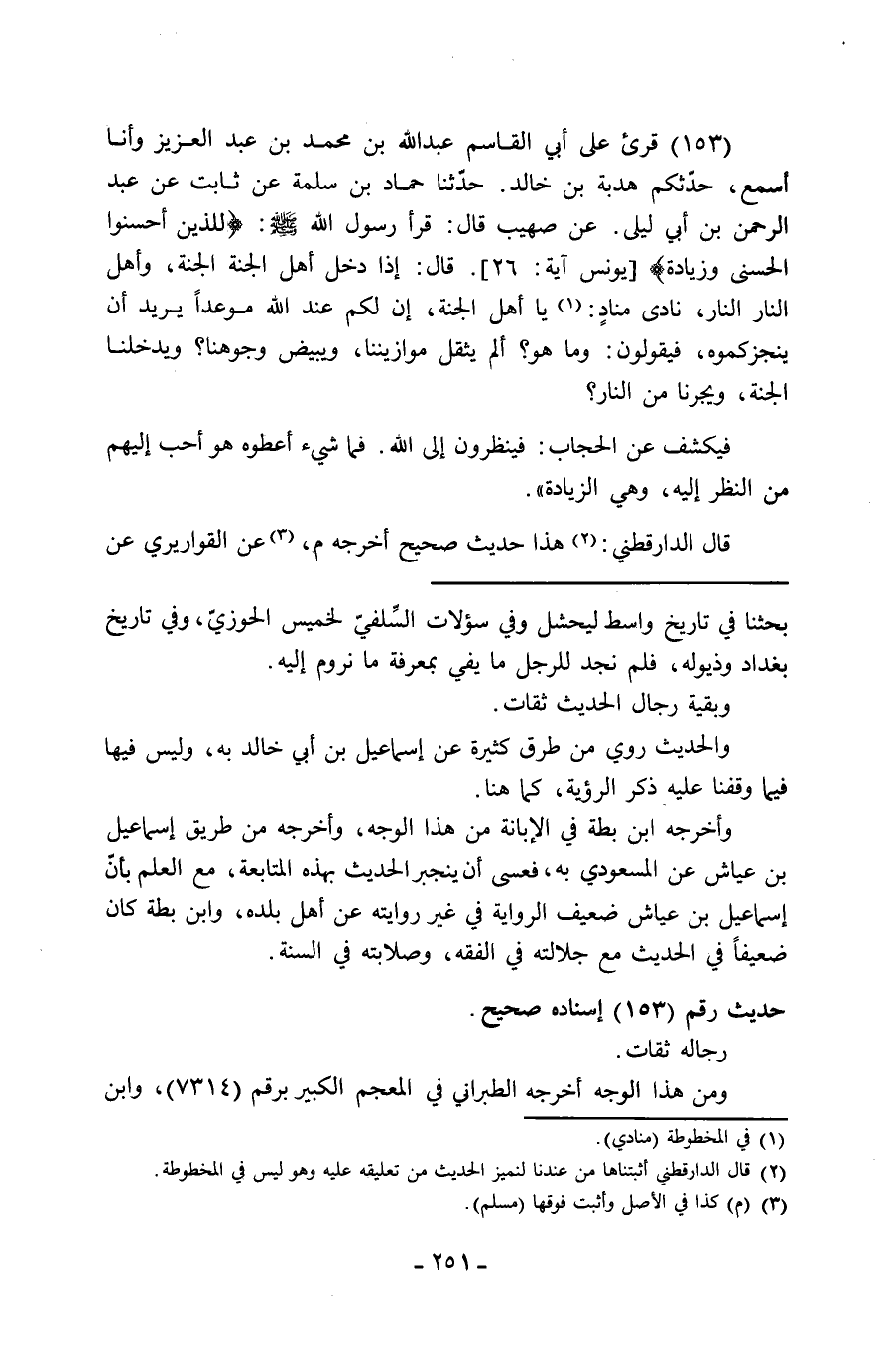 153 - قُرِئَ عَلَى أَبِي الْقَاسِمِ عَبْدِ اللَّهِ بْنِ مُحَمَّدِ بْنِ عَبْدِ الْعَزِيزِ، وَأَنَا أَسْمَعُ حَدَّثَكُمْ هُدْبَةُ بْنُ خَالِدٍ، حَدَّثَنَا حَمَّادُ بْنُ سَلَمَةَ، عَنْ ثَابِتٍ، عَنْ عَبْدِ الرَّحْمَنِ بْنِ أَبِي لَيْلَى، عَنْ صُهَيْبٍ، قَالَ: قَرَأَ رَسُولُ اللَّهِ صَلَّى اللَّهُ عَلَيْهِ وَسَلَّمَ: " {§لِلَّذِينَ أَحْسَنُوا الْحُسْنَى وَزِيَادَةٌ} [يونس: 26] ، قَالَ: إِذْ دَخَلَ أَهْلُ الْجَنَّةِ الْجَنَّةَ، وَأَهْلُ النَّارِ النَّارَ، نَادَى مُنَادٍ: يَا أَهْلَ الْجَنَّةِ، إِنَّ لَكُمْ عِنْدَ اللَّهِ مَوْعِدًا يُرِيدُ أَنْ يُنْجِزَكُمُوهُ، فَيَقُولُونَ: وَمَا هُوَ؟ أَلَمْ يُثَقِّلْ مَوَازِينَنَا، وَيُبَيِّضْ وُجُوهَنَا وَيُدْخِلْنَا الْجَنَّةَ، وَيُجِرْنَا مِنَ النَّارِ؟ فَيُكْشَفُ عَنِ الْحِجَابِ: فَيَنْظُرُونَ إِلَى اللَّهِ فَمَا شَيْءٌ أُعْطُوهُ هُوَ أَحَبُّ إِلَيْهِمْ مِنَ النَّظَرِ إِلَيْهِ، وَهِيَ الزِّيَادَةُ " قَالَ الدَّارَقُطْنِيُّ: هَذَا حَدِيثٌ صَحِيحٌ أَخْرَجَهُ مُسْلِمٌ عَنِ الْقَوَارِيرِيِّ عَنْ -[252]- عَبْدِ الرَّحْمَنِ بْنِ مَهْدِيٍّ، وَعَنْ أَبِي بَكْرِ بْنِ أَبِي شَيْبَةَ، عَنْ يَزِيدَ بْنِ هَارُونَ جَمِيعًا، عَنْ حَمَّادِ بْنِ سَلَمَةَ بِهَذَا الْإِسْنَادِ