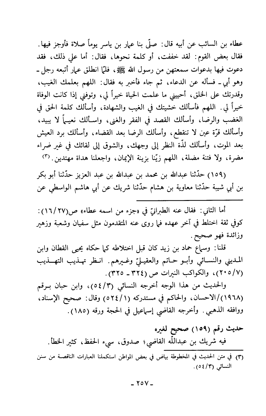 159 - حَدَّثَنَا عَبْدُ اللَّهِ بْنُ مُحَمَّدِ بْنِ عَبْدِ اللَّهِ بْنِ عَبْدِ الْعَزِيزِ، حَدَّثَنَا أَبُو بَكْرِ بْنُ أَبِي شَيْبَةَ، حَدَّثَنَا مُعَاوِيَةُ بْنُ هِشَامٍ، حَدَّثَنَا شَرِيكٌ، عَنْ أَبِي هَاشِمٍ الْوَاسِطِيِّ، عَنْ -[258]- أَبِي مِجْلَزٍ، عَنْ قَيْسِ بْنِ عَبَّادٍ، قَالَ: صَلَّى عَمَّارُ بْنُ يَاسِرٍ بِالْقَوْمِ صَلَاةً أَخَفَّهَا، فَكَأَنَّهُمْ أَنْكَرُوهَا، فَقَالَ: أَلَمْ أُتِمَّ الرُّكُوعَ وَالسُّجُودَ؟ قَالُوا: بَلَى، فَقَالَ: أَمَا إِنِّي دَعَوْتُ فِيهَا بِدُعَاءٍ، كَانَ نَبِيُّ اللَّهِ صَلَّى اللَّهُ عَلَيْهِ وَسَلَّمَ يَدْعُو بِهِ: «اللَّهُمَّ §بِعِلْمِكَ الْغَيْبَ وَقُدْرَتِكَ عَلَى الْخَلْقِ، أَحْيِنِي مَا عَلِمْتَ الْحَيَاةَ خَيْرًا لِي، وَتَوَفَّنِي إِذَا عَلِمْتَ الْوَفَاةَ خَيْرًا لِي، وَأَسْأَلُكَ خَشْيَتَكَ فِي الْغَيْبِ وَالشَّهَادَةِ، وَكَلِمَةَ الْإِخْلَاصِ فِي الرِّضَا وَالْغَضَبِ، وَأَسْأَلُكَ نَعِيمًا لَا يَنْفَدُ وَقُرَّةَ عَيْنٍ لَا تَنْقَطِعُ، وَأَسْأَلُكَ الرِّضَا بِالْقَضَاءِ، وَبَرْدَ الْعَيْشِ بَعْدَ الْمَوْتِ، وَلَذَّةَ النَّظَرِ إِلَى وَجْهِكَ، وَالشَّوْقَ إِلَى لِقَائِكَ، وَأَعُوذُ بِكَ مِنْ ضَرَّاءَ مُضِرَّةٍ، وَفِتْنَةٍ مُضِلَّةٍ، اللَّهُمَّ زَيِّنَّا بِزِينَةِ الْإِيمَانِ، وَاجْعَلْنَا هُدَاةً مُهْتَدِينَ»