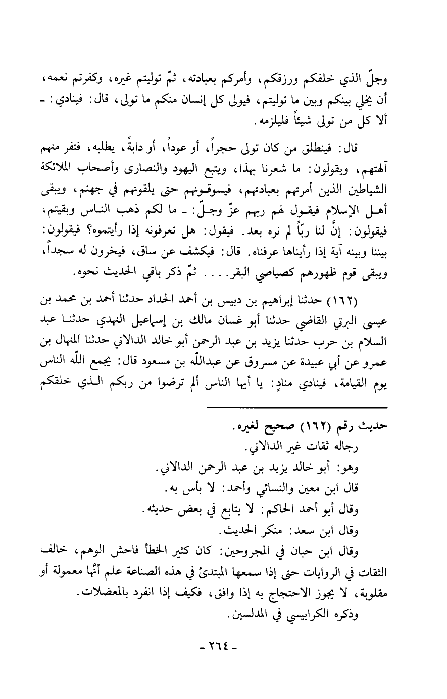 162 - حَدَّثَنَا إِبْرَاهِيمُ بْنُ دُبَيْسِ بْنِ أَحْمَدَ الْحَدَّادُ، حَدَّثَنَا أَحْمَدُ بْنُ مُحَمَّدِ بْنِ عِيسَى الْبِرْتِيُّ الْقَاضِي، حَدَّثَنَا أَبُو غَسَّانَ مَالِكُ بْنُ إِسْمَاعِيلَ النَّهْدِيُّ، حَدَّثَنَا عَبْدُ السَّلَامِ بْنُ حَرْبٍ، حَدَّثَنَا يَزِيدُ بْنُ عَبْدِ الرَّحْمَنِ أَبُو خَالِدٍ الدَّالَانِيُّ، حَدَّثَنَا الْمِنْهَالُ بْنُ عَمْرٍو، عَنْ أَبِي عُبَيْدَةَ، عَنْ مَسْرُوقٍ، عَنْ عَبْدِ اللَّهِ بْنِ مَسْعُودٍ، قَالَ: " §يَجْمَعُ اللَّهُ النَّاسَ يَوْمَ الْقِيَامَةِ فَيُنَادِي مُنَادٍ: يَا أَيُّهَا النَّاسُ، أَلَمْ تَرْضُوا مِنْ رَبِّكُمُ الَّذِي خَلَقَكُمْ -[265]- وَصَوَّرَكُمْ وَرَزَقَكُمْ، أَنْ يُوَلِّيَ كُلَّ إِنْسَانٍ مِنْكُمْ مَا كَانَ يَعْبُدُ فِي الدُّنْيَا وَيَتَوَلَّى؟ أَلَيْسَ ذَلِكَ مِنْ رَبِّكُمْ عَدْلٌ؟ قَالُوا: بَلَى، قَالَ: فَيَنْطَلِقُ كُلُّ إِنْسَانٍ مِنْكُمْ إِلَى مَا كَانَ يَتَوَلَّى فِي الدُّنْيَا، وَيُمَثِّلُ لَهُمْ مَا كَانُوا يَعْبُدُونَ فِي الدُّنْيَا، وَيُمَثِّلُ لِمَنْ كَانَ يَعْبُدُ عِيسَى شَيْطَانَ عِيسَى، وَيُمَثِّلُ لِمَنْ كَانَ يَعْبُدُ عُزَيْرًا شَيْطَانَ عُزَيْرٍ، حَتَّى يُمَثِّلَ لَهُمُ الشَّجَرَةَ وَالْعَوْدَ وَالْحَجَرَ، وَيَبْقَى أَهْلُ الْإِسْلَامِ جُثُومًا، فَيَقُولُ لَهُمْ: مَا لَكُمْ لَمْ تَنْطَلِقُوا كَمَا انْطَلَقَ النَّاسُ؟ فَيَقُولُونَ: لَنَا رَبٌّ مَا رَأَيْنَاهُ بَعْدُ، قَالَ: فَيَقُولُ: فَبِمَ تَعْرِفُونَ رَبَّكُمْ إِنْ رَأَيْتُمُوهُ؟ قَالُوا: بَيْنَنَا وَبَيْنَهُ عَلَامَةٌ، إِنْ رَأَيْنَاهُ عَرَفْنَاهُ، قَالَ: وَمَا هِيَ؟ قَالُوا: يَكْشِفُ عَنْ سَاقِهِ، قَالَ: فَيُكْشَفُ عِنْدَ ذَلِكَ عَنْ سَاقٍ، فَيَخِرُّ كُلُّ شَيْءٍ كَانَ لِظَهْرِهِ سَاجِدًا وَيَبْقَى قَوْمٌ ظُهُورُهُمْ كَصَيَاصِي الْبَقَرِ، يُرِيدُونَ السُّجُودَ فَلَا يَسْتَطِيعُونَ، ثُمَّ يُؤْمَرُونَ فَيَرْفَعُونَ رُءُوسَهُمْ عَلَى قَدْرِ أَعْمَالِهِمْ، فَمِنْهُمْ مَنْ يُعْطَى نُورَهُ مِثْلَ الْجَبَلِ بَيْنَ يَدَيْهِ، وَمِنْهُمْ مَنْ يُعْطَى نُورَهُ مِثْلَ النَّخْلَةِ بِيَمِينِهِ، وَمِنْهُمْ مَنْ يُعْطَى دُونَ ذَلِكَ، حَتَّى يَكُونَ آخِرُ ذَلِكَ مَنْ يُعْطَى نُورَهُ عَلَى إِبْهَامِ قَدَمِهِ يُضِيءُ مَرَّةً وَيُطْفِئُ مَرَّةً، فَإِذَا أَضَاءَ قَدَّمَ قَدَمَهُ، فَإِذَا طُفِئَ قَامَ، فَيَمُرُّونَ عَلَى الصِّرَاطِ كَحَدِّ السَّيْفِ دَحْضٌ مَزِلَّةٌ، فَيُقَالَ لَهُمُ: انْجُوا عَلَى قَدْرِ نُورِكُمْ، فَمِنْهُمْ مَنْ يَمُرُّ كَانْقِضَاضِ الْكَوَاكِبِ، وَمِنْهُمْ مَنْ يَمُرُّ كَالطَّرْفِ، وَمِنْهُمْ مَنْ يَمُرُّ كَالرِّيحِ، وَمِنْهُمْ مَنْ يَمُرُّ كَشَدِّ الرَّجُلِ وَيَرْمُلُ رَمَلًا، فَيَمُرُّونَ عَلَى قَدْرِ أَعْمَالِهِمْ، حَتَّى يَمُرَّ -[266]- الَّذِي نُورُهُ عَلَى إِبْهَامِ قَدَمِهِ، يَجُرُّ يَدًا وَيُعَلِّقُ يَدًا، وَيَجُرُّ رِجْلًا وَيُعَلَّقُ رِجْلًا، وَتُصِيبُ جَوَانِبَهُ النَّارُ، قَالَ: فَيَخْلُصُونَ، فَإِذَا خَلَصُوا قَالُوا: الْحَمْدُ لِلَّهِ الَّذِي نَجَّانَا مِنْكِ بَعْدَ الَّذِي أَرَانَاكَ، لَقَدْ أَعْطَانَا اللَّهُ عَزَّ وَجَلَّ مَا لَمْ يُعْطِ أَحَدًا "، وَسَاقَ الْحَدِيثَ بِطُولِهِ إِلَى قَوْلِهِ: فَيَقُولُ: «أَلَمْ تَرْضُوا أَنْ أُعْطِيَكُمَ مِثْلَ الدُّنْيَا مُنْذُ يَوْمِ خَلَقْتُهَا إِلَى يَوْمِ أَفْنَيْتُهَا، وَعَشَرَةَ أَضْعَافِهَا؟» فَلَمَّا بَلَغَ عَبْدُ اللَّهِ هَذَا الْمَكَانَ مِنْ هَذَا الْحَدِيثِ ضَحِكَ، فَيُقَالُ لَهُ: يَا أَبَا عَبْدِ الرَّحْمَنِ، لَقَدْ حَدَّثْتَ هَذَا الْحَدِيثَ مِرَارًا، فَلَمَّا بَلَغْتَ هَذَا الْمَكَانَ مِنْهُ ضَحِكْتَ، قَالَ عَبْدُ اللَّهِ: سَمِعْتُ رَسُولَ اللَّهِ صَلَّى الل