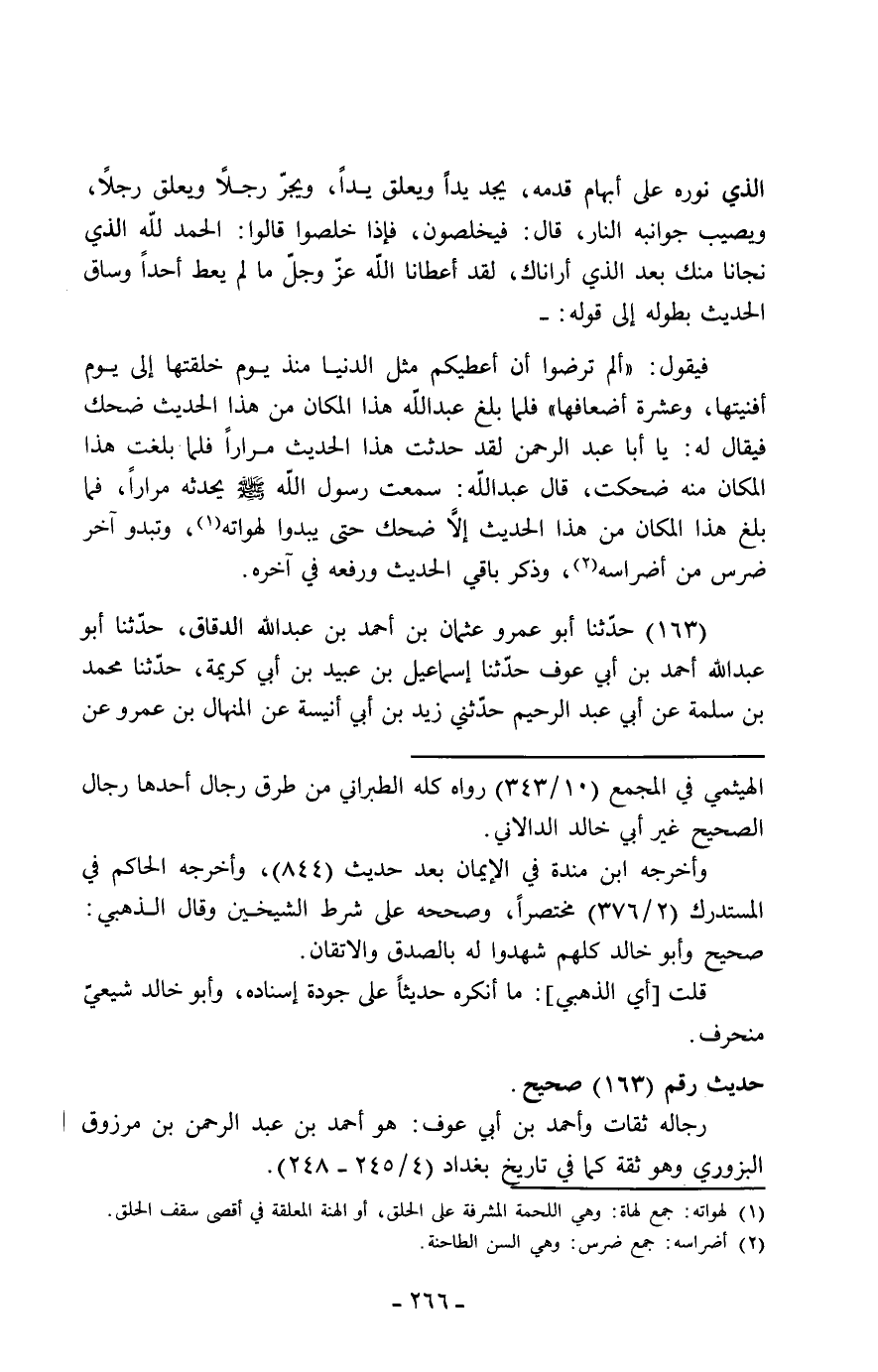 163 - حَدَّثَنَا أَبُو عَمْرٍو عُثْمَانُ بْنُ أَحْمَدَ بْنِ عَبْدِ اللَّهِ الدَّقَّاقُ، حَدَّثَنَا أَبُو عَبْدِ اللَّهِ أَحْمَدُ بْنُ أَبِي عَوْفٍ، حَدَّثَنَا إِسْمَاعِيلُ بْنُ عُبَيْدِ بْنِ أَبِي كَرِيمَةَ، حَدَّثَنَا مُحَمَّدُ بْنُ سَلَمَةَ، عَنْ أَبِي عَبْدِ الرَّحِيمِ، حَدَّثَنِي زَيْدُ بْنُ أَبِي أُنَيْسَةَ، عَنِ الْمِنْهَالِ بْنِ عَمْرٍو، عَنْ -[267]- أَبِي عُبَيْدَةَ، عَنْ مَسْرُوقٍ، حَدَّثَنَا عَبْدُ اللَّهِ بْنُ مَسْعُودٍ، عَنِ النَّبِيِّ صَلَّى اللَّهُ عَلَيْهِ وَسَلَّمَ قَالَ: " §يَجْمَعُ اللَّهُ عَزَّ وَجَلَّ الْأَوَّلِينَ وَالْآخِرِينَ لِمِيقَاتِ يَوْمٍ مَعْلُومٍ، قِيَامًا أَرْبَعِينَ سَنَةً، شَاخِصَةً أَبْصَارُهُمْ إِلَى السَّمَاءِ، يَنْتَظِرُونَ فَصْلَ الْقَضَاءِ، وَيَنْزِلُ اللَّهُ عَزَّ وَجَلَّ فِي ظُلَلٍ مِنَ الْغَمَامِ مِنَ الْعَرْشِ إِلَى الْكُرْسِيِّ، ثُمَّ يُنَادِي مُنَادٍ: أَلَمْ تَرْضُوا مِنْ رَبِّكُمْ عَزَّ وَجَلَّ الَّذِي خَلَقَكُمْ وَرَزَقَكُمْ، وَأَمَرَكُمْ أَنْ تَعْبُدُوهُ وَلَا تُشْرِكُوا بِهِ شَيْئًا، أَنْ يُوَلِّيَ كُلَّ إِنْسَانٍ مِنْكُمْ مَا كَانَ يَتَوَلَّى وَيَعْبُدُ فِي الدُّنْيَا، أَلَيْسَ ذَلِكَ عَدْلًا مِنْ رَبِّكُمْ؟ قَالُوا: بَلَى " ثُمَّ ذَكَرَ نَحْوَهُ وَرَفَعَهُ فِي أَوَّلِهِ قَالَ الدَّارَقُطْنِيُّ: وَرَوَى هَذَا الْحَدِيثَ الْأَعْمَشُ عَنِ الْمِنْهَالِ، وَلَمْ يَذْكُرْ فِيهِ مَسْرُوقًا