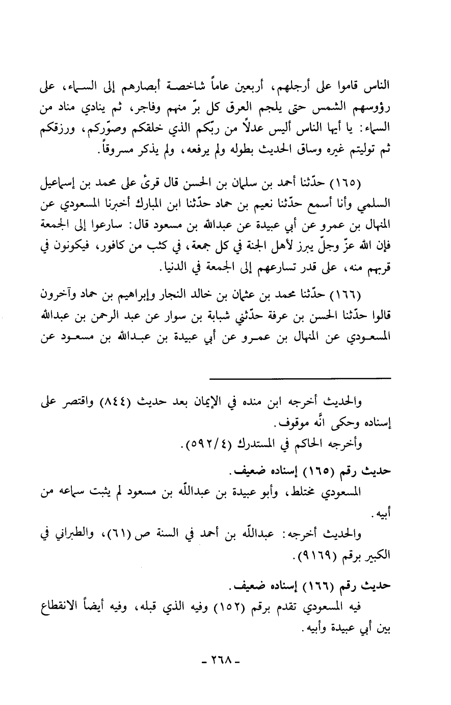 165 - حَدَّثَنَا أَحْمَدُ بْنُ سَلْمَانَ بْنِ الْحَسَنِ، قَالَ: قُرِئَ عَلَى مُحَمَّدِ بْنِ إِسْمَاعِيلَ السُّلَمِيِّ، وَأَنَا أَسْمَعُ: حَدَّثَنَا نُعَيْمُ بْنُ حَمَّادٍ، حَدَّثَنَا ابْنُ الْمُبَارَكِ، أَخْبَرَنَا الْمَسْعُودِيُّ، عَنِ الْمِنْهَالِ بْنِ عَمْرٍو، عَنْ أَبِي عُبَيْدَةَ، عَنْ عَبْدِ اللَّهِ بْنِ مَسْعُودٍ، قَالَ: «§سَارِعُوا إِلَى الْجُمُعَةِ؛ فَإِنَّ اللَّهَ عَزَّ وَجَلَّ يَبْرُزَ لِأَهْلِ الْجَنَّةِ فِي كُلِّ جُمُعَةٍ فِي كُثُبٍ مِنْ كَافُورٍ، فَيَكُونُونَ فِي قُرْبِهِمْ مِنْهُ عَلَى قَدْرِ تَسَارُعِهِمْ إِلَى الْجُمُعَةِ فِي الدُّنْيَا»