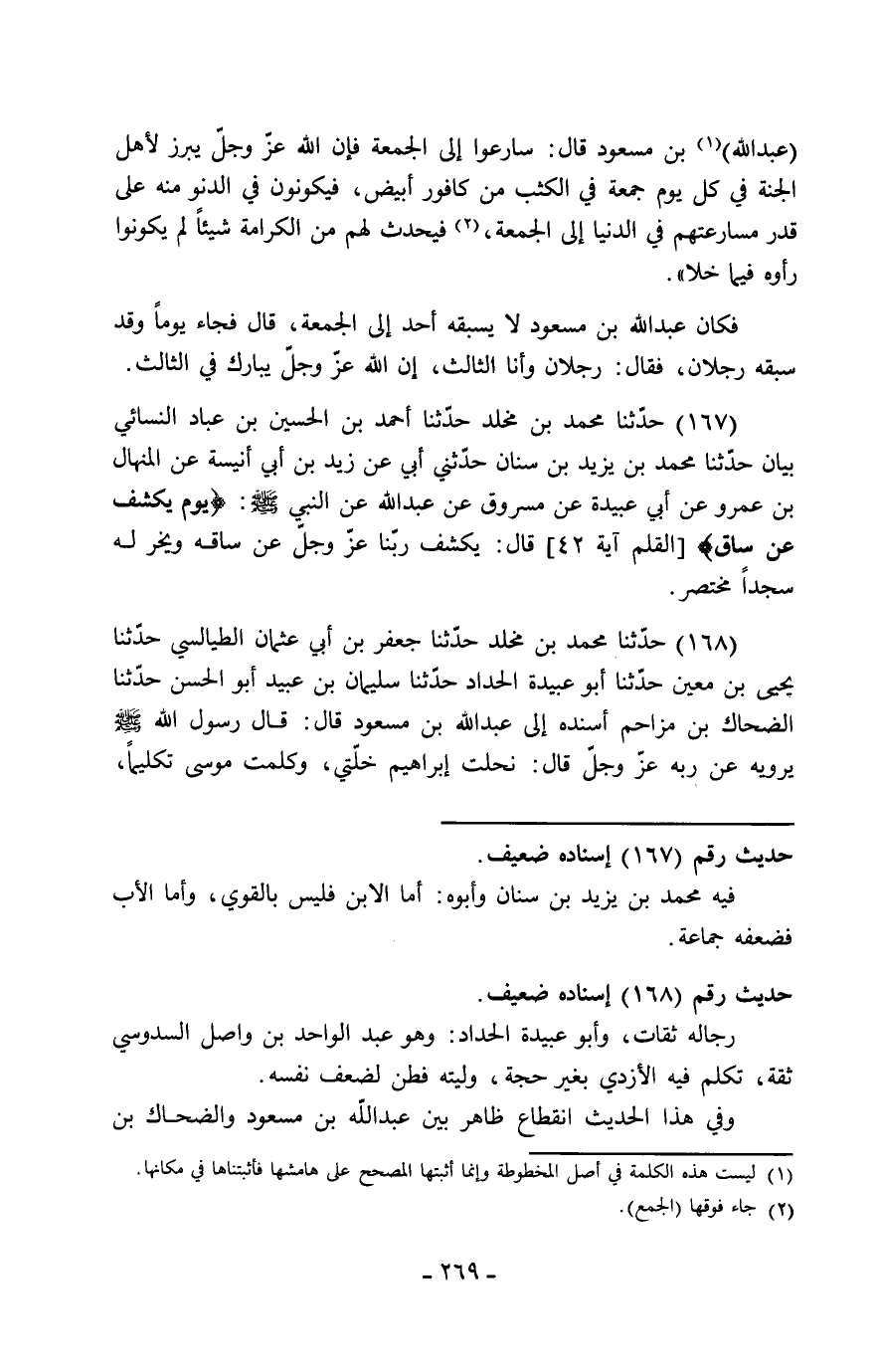 167 - حَدَّثَنَا مُحَمَّدُ بْنُ مَخْلَدٍ، حَدَّثَنَا أَحْمَدُ بْنُ الْحُسَيْنِ بْنِ عَبَّادٍ النَّسَائِيُّ بَيَانٌ، حَدَّثَنَا مُحَمَّدُ بْنُ يَزِيدَ بْنِ سِنَانٍ، حَدَّثَنِي أَبِي، عَنْ زَيْدِ بْنِ أَبِي أُنَيْسَةَ، عَنِ الْمِنْهَالِ بْنِ عَمْرٍو، عَنْ أَبِي عُبَيْدَةَ، عَنْ مَسْرُوقٍ، عَنْ عَبْدِ اللَّهِ، عَنِ النَّبِيِّ صَلَّى اللَّهُ عَلَيْهِ وَسَلَّمَ: " {§يَوْمَ يُكْشَفُ عَنْ سَاقٍ} [القلم: 42] " قَالَ: «يَكْشِفُ رَبُّنَا عَزَّ وَجَلَّ عَنْ سَاقِهِ، وَيُخَرُّ لَهُ سُجَّدًا» مُخْتَصَرٌ