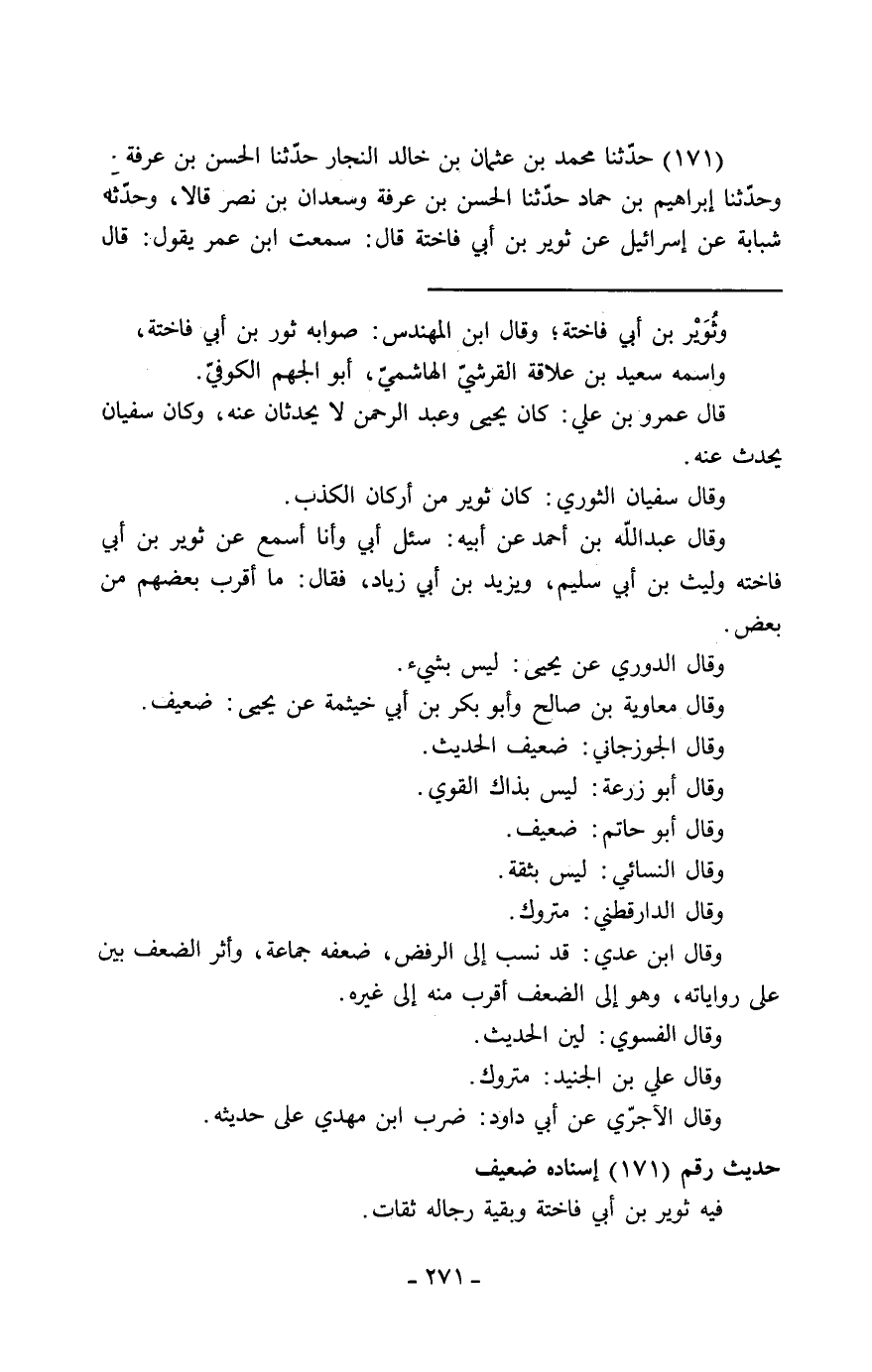 171 - حَدَّثَنَا مُحَمَّدُ بْنُ عُثْمَانَ بْنِ خَالِدٍ النَّجَّارُ، حَدَّثَنَا الْحَسَنُ بْنُ عَرَفَةَ، وَحَدَّثَنَا إِبْرَاهِيمُ بْنُ حَمَّادٍ، حَدَّثَنَا الْحَسَنُ بْنُ عَرَفَةَ، وَسَعْدَانُ بْنُ نَصْرٍ، قَالَا: وَحَدَّثَهُ شَبَابَةُ، عَنْ إِسْرَائِيلَ، عَنْ ثُوَيْرِ بْنِ أَبِي فَاخِتَةَ، قَالَ: سَمِعْتُ ابْنَ عُمَرَ، يَقُولُ: قَالَ -[272]- رَسُولُ اللَّهِ صَلَّى اللَّهُ عَلَيْهِ وَسَلَّمَ: " إِنَّ §أَدْنَى أَهْلِ الْجَنَّةِ مَنْزِلَةً لَمَنْ يَنْظُرُ إِلَى جَنَّاتِهِ وَنَعِيمِهِ وَأَزْوَاجِهِ وَسُرُرِهِ وَقَالَ ابْنُ عَرَفَةَ: وَسُرُورِهِ - وَزَادَ ابْنُ عَرَفَةَ - وَخَدَمِهِ مَسِيرَةَ أَلْفِ سَنَةٍ، وَأَكْرَمُهُمْ عَلَى اللَّهِ عَزَّ وَجَلَّ لَمَنْ يَنْظُرُ إِلَى وَجْهِهِ عَزَّ وَجَلَّ غُدْوَةً، وَعَشِيَّةً "، ثُمَّ قَرَأَ رَسُولُ اللَّهِ صَلَّى اللَّهُ عَلَيْهِ وَسَلَّمَ: " {وُجُوهٌ يَوْمَئِذٍ نَاضِرَةٌ إِلَى رَبِّهَا نَاظِرَةٌ} [القيامة: 23] "