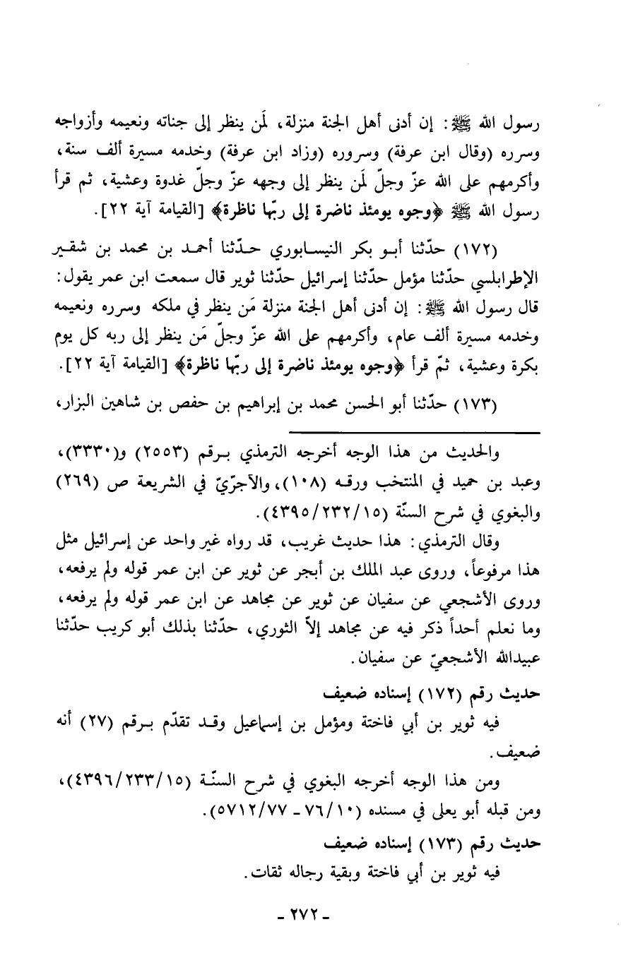 172 - حَدَّثَنَا أَبُو بَكْرٍ النَّيْسَابُورِيُّ، حَدَّثَنَا أَحْمَدُ بْنُ مُحَمَّدِ بْنِ شُقَيرٍ الْأَطْرَابُلْسِيُّ، حَدَّثَنَا مُؤَمَّلٌ، حَدَّثَنَا إِسْرَائِيلُ، حَدَّثَنَا ثُوَيْرٌ، قَالَ: سَمِعْتُ ابْنَ عُمَرَ، يَقُولُ: قَالَ رَسُولُ اللَّهِ صَلَّى اللَّهُ عَلَيْهِ وَسَلَّمَ: " إِنَّ §أَدْنَى أَهْلِ الْجَنَّةِ مَنْزِلَةً مَنْ يَنْظُرُ فِي مُلْكِهِ وَسُرُرِهِ وَنَعِيمِهِ وَخَدَمِهِ مَسِيرَةَ أَلْفِ عَامٍ، وَأَكْرَمُهُمْ عَلَى اللَّهِ عَزَّ وَجَلَّ مَنْ يَنْظُرُ إِلَى رَبِّهِ كُلَّ يَوْمٍ بُكْرَةً وَعَشِيَّةً - ثُمَّ قَرَأَ: {وُجُوهٌ يَوْمَئِذٍ نَاضِرَةٌ إِلَى رَبُّهَا نَاظِرَةٌ} [القيامة: 23] "
