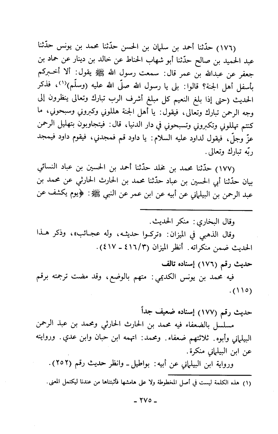 177 - حَدَّثَنَا مُحَمَّدُ بْنُ مَخْلَدٍ، حَدَّثَنَا أَحْمَدُ بْنُ الْحُسَيْنِ بْنِ عَبَّادٍ النَّسَائِيُّ بَيَانٌ، حَدَّثَنَا أَبِي الْحُسَيْنُ بْنُ عَبَّادٍ، حَدَّثَنَا مُحَمَّدُ بْنُ الْحَارِثِ الْحَارِثِيُّ، عَنْ مُحَمَّدِ بْنِ عَبْدِ الرَّحْمَنِ بْنِ الْبَيْلَمَانِيِّ، عَنْ أَبِيهِ، عَنِ ابْنِ عُمَرَ، عَنِ النَّبِيِّ صَلَّى اللَّهُ عَلَيْهِ وَسَلَّمَ: " §يَوْمَ يُكْشَفُ عَنْ -[276]- سَاقٍ قَالَ: يَكْشِفُ رَبُّنَا عَزَّ وَجَلَّ عَنْ سَاقِهِ وَيُخَرُّ لَهُ سُجَّدًا " مُخْتَصَرَةً