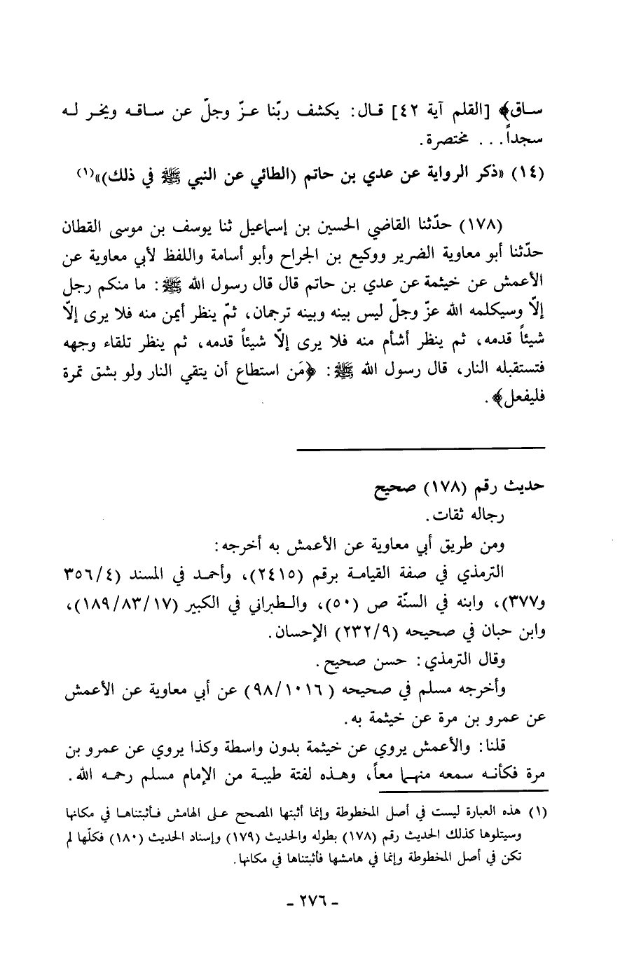 178 - حَدَّثَنَا الْقَاضِي الْحُسَيْنُ بْنُ إِسْمَاعِيلَ، ثنا يُوسُفُ الْقَطَّانُ، حَدَّثَنَا أَبُو مُعَاوِيَةَ الضَّرِيرُ، وَوَكِيعُ بْنُ الْجَرَّاحِ، وَأَبُو أُسَامَةَ، وَاللَّفْظُ لِأَبِي مُعَاوِيَةَ، عَنِ الْأَعْمَشِ، عَنْ خَيْثَمَةَ، عَنْ عَدِيِّ بْنِ حَاتِمٍ، قَالَ: قَالَ رَسُولُ اللَّهِ صَلَّى اللَّهُ عَلَيْهِ وَسَلَّمَ: «§مَا مِنْكُمْ رَجُلٌ إِلَّا وَسَيُكَلِّمُهُ اللَّهُ عَزَّ وَجَلَّ لَيْسَ بَيْنَهُ وَبَيْنَهُ تُرْجُمَانٌ، ثُمَّ يَنْظُرُ أَيْمَنَ مِنْهُ فَلَا يَرَى إِلَّا شَيْئًا قَدَّمَهُ، ثُمَّ يَنْظُرُ أَشْأَمَ مِنْهُ فَلَا يَرَى إِلَّا شَيْئًا قَدَّمَهُ، ثُمَّ يَنْظُرُ تِلْقَاءَ وَجْهِهِ فَتَسْتَقْبِلُهُ النَّارُ» ، قَالَ رَسُولُ اللَّهِ صَلَّى اللَّهُ عَلَيْهِ وَسَلَّمَ: «مَنِ اسْتَطَاعَ أَنْ يَتَّقِيَ النَّارَ وَلَوْ بِشِقِّ تَمْرَةٍ فَلْيَفْعَلْ» -[277]-