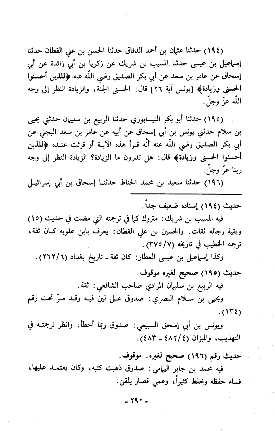 194 - حَدَّثَنَا عُثْمَانُ بْنُ أَحْمَدَ الدَّقَّاقُ، حَدَّثَنَا الْحَسَنُ بْنُ عَلِيٍّ الْقَطَّانُ، حَدَّثَنَا إِسْمَاعِيلُ بْنُ عِيسَى، حَدَّثَنَا الْمُسَيَّبُ بْنُ شَرِيكٍ، عَنْ زَكَرِيَّا بْنِ أَبِي زَائِدَةَ، عَنْ أَبِي إِسْحَاقَ، عَنْ عَامِرِ بْنِ سَعْدٍ، عَنْ أَبِي بَكْرٍ الصِّدِّيقِ، رَضِيَ اللَّهُ عَنْهُ: " {§لِلَّذِينَ أَحْسَنُوا الْحُسْنَى وَزِيَادَةٌ} [يونس: 26] قَالَ: الْحُسْنَى الْجَنَّةُ، وَالزِّيَادَةُ النَّظَرُ إِلَى وَجْهِ اللَّهِ عَزَّ وَجَلَّ "