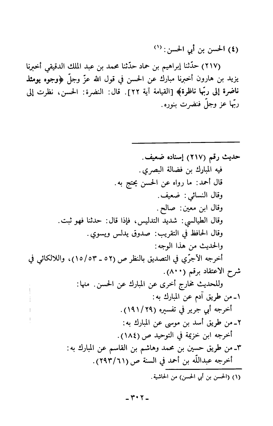 217 - حَدَّثَنَا إِبْرَاهِيمُ بْنُ حَمَّادٍ، حَدَّثَنَا مُحَمَّدُ بْنُ عَبْدِ الْمَلِكِ الدَّقِيقِيُّ، أَخْبَرَنَا يَزِيدُ بْنُ هَارُونَ، أَخْبَرَنَا مُبَارَكٌ، عَنِ الْحَسَنِ فِي قَوْلِ اللَّهِ عَزَّ وَجَلَّ: " {§وُجُوهٌ يَوْمَئِذٍ نَاضِرَةٌ إِلَى رَبِّهَا نَاظِرَةٌ} [القيامة: 23] قَالَ: النَّضْرَةُ: الْحُسْنُ، نَظَرَتْ إِلَى رَبِّهَا عَزَّ وَجَلَّ فَنَضَرَتْ بِنُورِهِ "