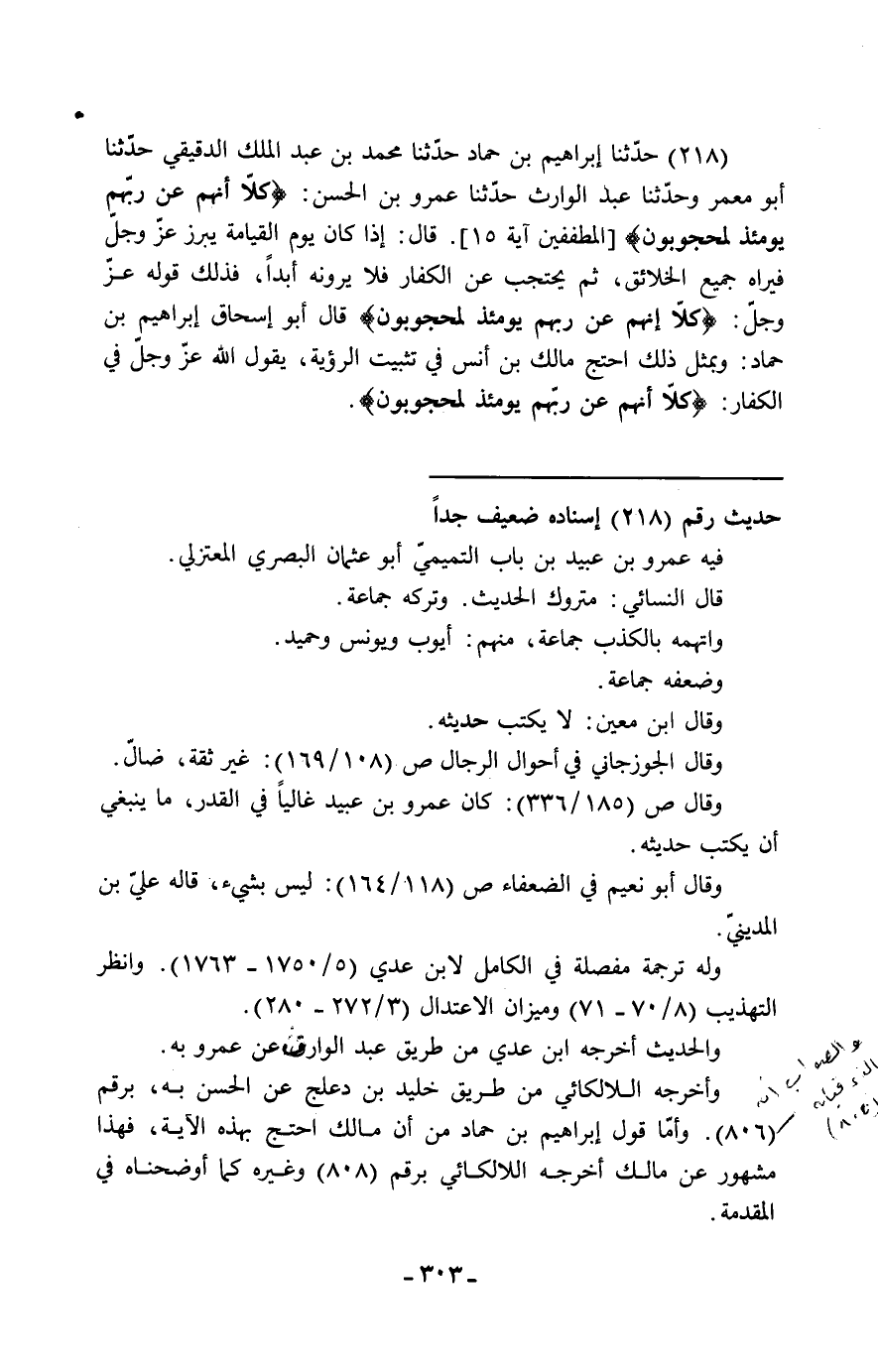 218 - حَدَّثَنَا إِبْرَاهِيمُ بْنُ حَمَّادٍ، حَدَّثَنَا مُحَمَّدُ بْنُ عَبْدِ الْمَلِكِ الدَّقِيقِيُّ، حَدَّثَنَا أَبُو مَعْمَرٍ، وَحَدَّثَنَا عَبْدُ الْوَارِثِ، حَدَّثَنَا عَمْرُو بْنُ الْحَسَنِ: " {§كَلَّا إِنَّهُمْ عَنْ رَبِّهِمْ يَوْمَئِذٍ لَمَحْجُوبُونَ} [المطففين: 15] قَالَ: إِذَا كَانَ يَوْمُ الْقِيَامَةِ يَبْرُزُ عَزَّ وَجَلَّ فَيَرَاهُ جَمِيعُ الْخَلَائِقِ، ثُمَّ يَحْتَجِبُ عَنِ الْكُفَّارِ فَلَا يَرَوْنَهُ أَبَدًا، فَذَلِكَ قَوْلُهُ عَزَّ وَجَلَّ: {كَلَّا إِنَّهُمْ عَنْ رَبِّهِمْ يَوْمَئِذٍ لَمَحْجُوبُونَ} [المطففين: 15] " قَالَ أَبُو إِسْحَاقَ إِبْرَاهِيمُ بْنُ حَمَّادٍ: وَبِمِثْلِ ذَلِكَ احْتَجَّ مَالِكُ بْنُ أَنَسٍ فِي تَثْبِيتِ الرُّؤْيَةِ، يَقُولُ اللَّهُ عَزَّ وَجَلَّ فِي الْكُفَّارِ: {كَلَّا إِنَّهُمْ عَنْ رَبِّهِمْ يَوْمَئِذٍ لَمَحْجُوبُونَ} [المطففين: 15]
