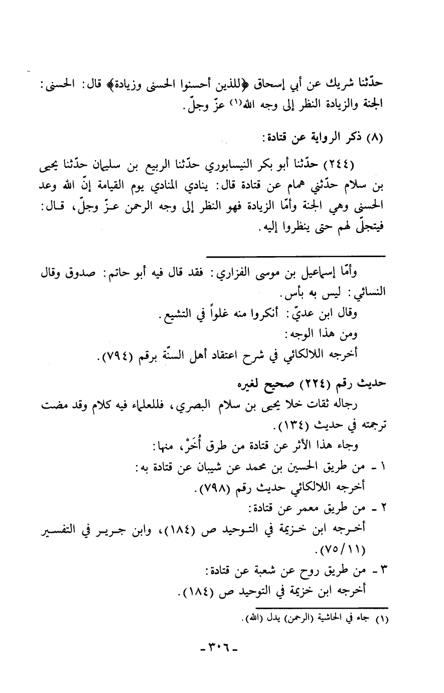 224 - حَدَّثَنَا أَبُو بَكْرٍ النَّيْسَابُورِيُّ، حَدَّثَنَا الرَّبِيعُ بْنُ سُلَيْمَانَ، حَدَّثَنَا يَحْيَى بْنُ سَلَّامٍ، حَدَّثَنِي هَمَّامٌ، عَنْ قَتَادَةَ، قَالَ: " §يُنَادِي الْمُنَادِي يَوْمَ الْقِيَامَةِ: إِنَّ اللَّهَ وَعَدَ الْحُسْنَى وَهِيَ الْجَنَّةُ، وَأَمَّا الزِّيَادَةُ فَهُوَ النَّظَرُ إِلَى وَجْهِ الرَّحْمَنِ عَزَّ وَجَلَّ قَالَ: فَيَتَجَلَّى لَهُمْ حَتَّى يَنْظُرُوا إِلَيْهِ "
