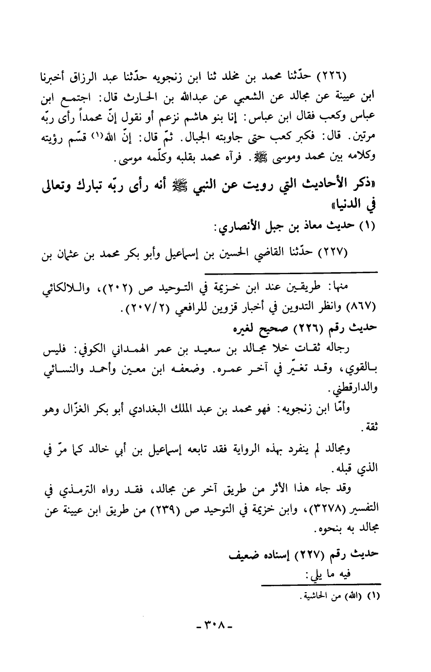 226 - حَدَّثَنَا مُحَمَّدُ بْنُ مَخْلَدٍ، ثنا ابْنُ زَنْجُوَيْهِ، حَدَّثَنَا عَبْدُ الرَّزَّاقِ، أَخْبَرَنَا ابْنُ عُيَيْنَةَ، عَنْ مُجَالِدٍ، عَنِ الشَّعْبِيِّ، عَنْ عَبْدِ اللَّهِ بْنِ الْحَارِثِ، قَالَ: اجْتَمَعَ ابْنُ عَبَّاسٍ، وَكَعْبٌ، فَقَالَ ابْنُ عَبَّاسٍ: إِنَّا بَنُو هَاشِمٍ نَزْعُمُ أَوْ نَقُولُ: إِنَّ مُحَمَّدًا رَأَى رَبَّهُ مَرَّتَيْنِ قَالَ: فَكَبَّرَ كَعْبٌ حَتَّى جَاوَبَتْهُ الْجِبَالُ، ثُمَّ قَالَ: «إِنَّ اللَّهَ §قَسَمَ رُؤْيَتَهُ وَكَلَامَهُ بَيْنَ مُحَمَّدٍ صَلَّى اللَّهُ عَلَيْهِ وَسَلَّمَ وَمُوسَى، فَرَآهُ مُحَمَّدٌ بِقَلْبِهِ، وَكَلَّمَهُ مُوسَى»