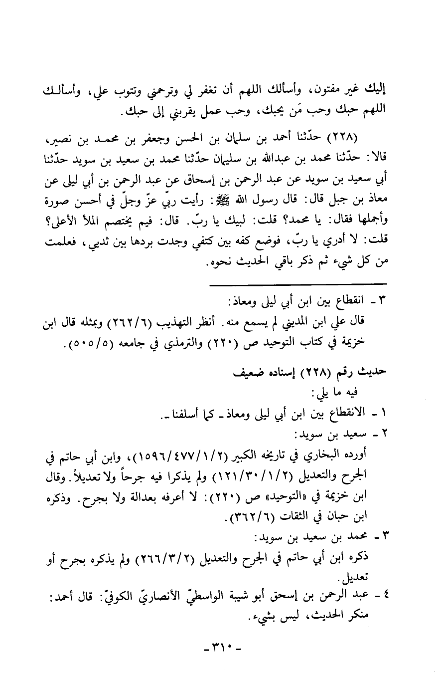228 - حَدَّثَنَا أَحْمَدُ بْنُ سَلْمَانَ بْنِ الْحَسَنِ، وَجَعْفَرُ بْنُ مُحَمَّدِ بْنِ نُصَيْرٍ، قَالَا: حَدَّثَنَا مُحَمَّدُ بْنُ عَبْدِ اللَّهِ بْنِ سُلَيْمَانَ، حَدَّثَنَا مُحَمَّدُ بْنُ سَعِيدِ بْنِ سُوَيْدٍ، حَدَّثَنَا أَبِي سَعِيدُ بْنُ سُوَيْدٍ، عَنْ عَبْدِ الرَّحْمَنِ بْنِ إِسْحَاقَ، عَنْ عَبْدِ الرَّحْمَنِ بْنِ أَبِي لَيْلَى، عَنْ مُعَاذِ بْنِ جَبَلٍ، قَالَ: قَالَ رَسُولُ اللَّهِ صَلَّى اللَّهُ عَلَيْهِ وَسَلَّمَ: " §رَأَيْتُ رَبِّي عَزَّ وَجَلَّ فِي أَحْسَنِ صُورَةٍ وَأَجْمَلِهَا، فَقَالَ: يَا مُحَمَّدُ، قُلْتُ: لَبَّيْكَ يَا رَبِّ، قَالَ: فِيمَ يَخْتَصِمُ الْمَلَأُ الْأَعْلَى؟ قُلْتُ: لَا أَدْرِي يَا رَبِّ، فَوَضَعَ كَفَّهُ بَيْنَ كَتِفَيَّ، فَوَجَدْتُ بَرْدَهَا بَيْنَ ثَدْيَيَّ، فَعَلِمْتُ مِنْ كُلِّ شَيْءٍ " ثُمَّ ذَكَرَ بَاقِيَ الْحَدِيثِ نَحْوَهُ