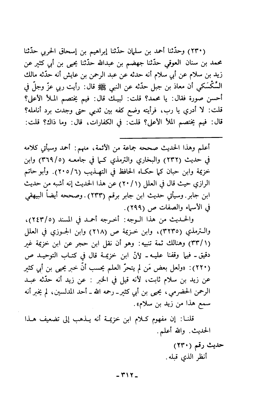 230 - وَحَدَّثَنَا أَحْمَدُ بْنُ سَلْمَانَ، حَدَّثَنَا إِبْرَاهِيمُ بْنُ إِسْحَاقَ الْحَرْبِيُّ، حَدَّثَنَا مُحَمَّدُ بْنُ سِنَانٍ الْعَوَقِيُّ، حَدَّثَنَا جَهْضَمُ بْنُ عَبْدِ اللَّهِ، حَدَّثَنَا يَحْيَى بْنُ أَبِي كَثِيرٍ، عَنْ زَيْدِ بْنِ سَلَّامٍ، عَنْ أَبِي سَلَّامٍ، أَنَّهُ حَدَّثَهُ عَنْ عَبْدِ الرَّحْمَنِ بْنِ عَايِشٍ، أَنَّهُ حَدَّثَهُ مَالِكٌ السَّكْسَكِيُّ، أَنَّ مُعَاذَ بْنَ جَبَلٍ حَدَّثَهُ، عَنِ النَّبِيِّ صَلَّى اللَّهُ عَلَيْهِ وَسَلَّمَ قَالَ: " §رَأَيْتُ رَبِّي عَزَّ وَجَلَّ فِي أَحْسَنِ صُورَةٍ، فَقَالَ: يَا مُحَمَّدُ، قُلْتُ: لَبَّيْكَ، قَالَ: فِيمَ يَخْتَصِمُ الْمَلَأُ الْأَعْلَى؟ قُلْتُ: لَا أَدْرِي يَا رَبِّ، فَرَأَيْتُهُ وَضَعَ كَفَّهُ بَيْنَ ثَدْيَيَّ حَتَّى وَجَدْتُ بَرْدَ أَنَامِلِهِ، قَالَ: فِيمَ يَخْتَصِمُ الْمَلَأُ الْأَعْلَى؟ قُلْتُ: فِي الْكَفَّارَاتِ، قَالَ: وَمَا ذَاكَ؟ قُلْتُ: -[313]- الْمَشْيُ عَلَى الْأَقْدَامِ إِلَى الْجُمُعَاتِ، وَالْجُلُوسُ فِي الْمَسَاجِدِ بَعْدَ الصَّلَاةِ، وَإِبْلَاغُ الْوُضُوءِ حَتَّى الْكَرِيهَاتِ "