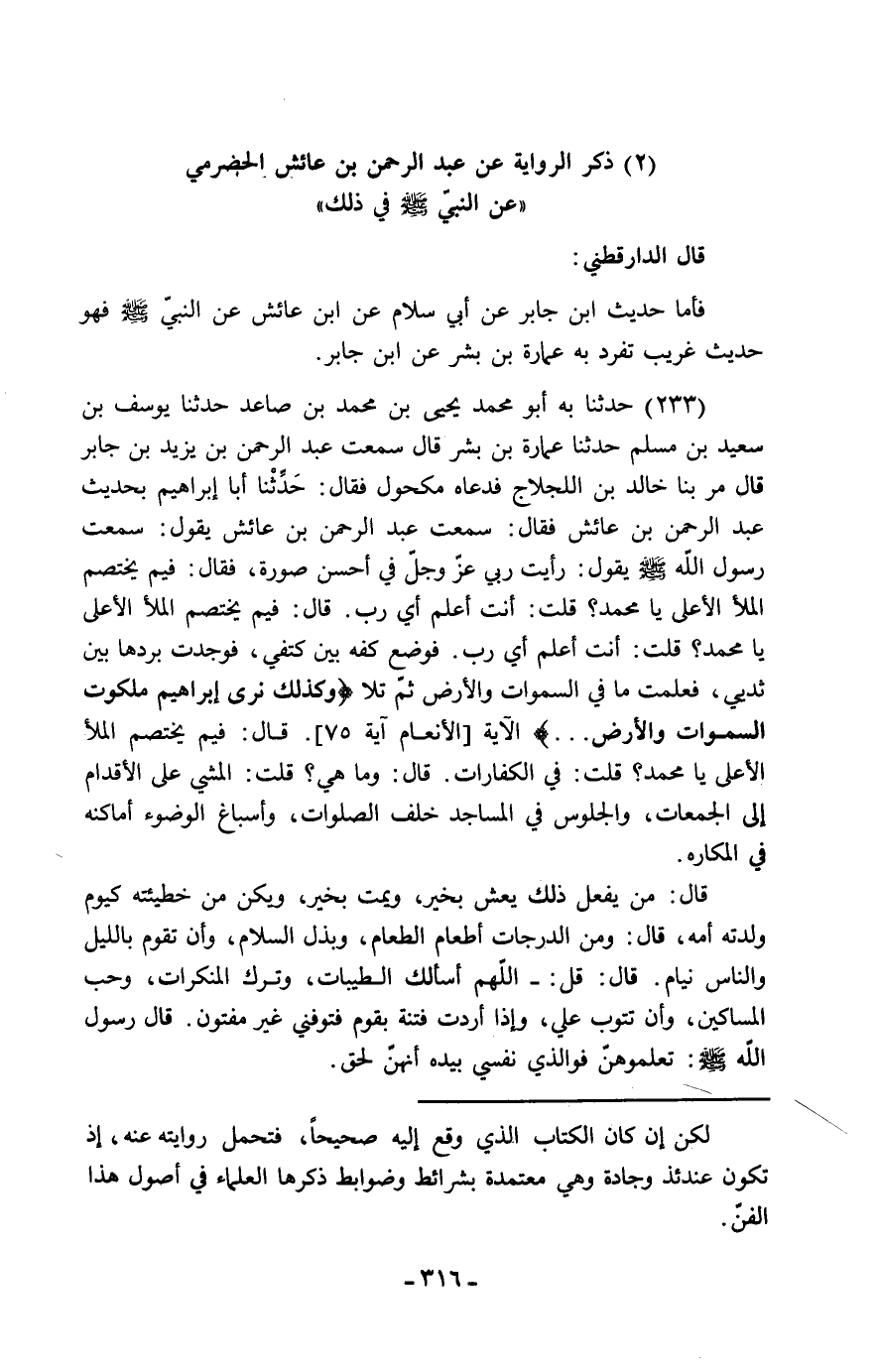 233 - حَدَّثَنَا بِهِ أَبُو مُحَمَّدٍ يَحْيَى بْنُ مُحَمَّدِ بْنِ صَاعِدٍ، حَدَّثَنَا يُوسُفُ بْنُ سَعِيدِ بْنِ مُسْلِمٍ، حَدَّثَنَا عُمَارَةُ بْنُ بِشْرٍ، قَالَ: سَمِعْتُ عَبْدَ الرَّحْمَنِ بْنَ يَزِيدَ بْنِ جَابِرٍ، قَالَ: مَرَّ بِنَا خَالِدُ بْنُ اللَّجْلَاجِ، فَدَعَاهُ مَكْحُولٌ فَقَالَ: حَدِّثْنَا أَبَا إِبْرَاهِيمَ بِحَدِيثِ عَبْدِ الرَّحْمَنِ بْنِ عَائِشٍ، فَقَالَ: سَمِعْتُ عَبْدَ الرَّحْمَنِ بْنَ عَائِشٍ، يَقُولُ: سَمِعْتُ رَسُولَ اللَّهِ صَلَّى اللَّهُ عَلَيْهِ وَسَلَّمَ يَقُولُ: " §رَأَيْتُ رَبِّي عَزَّ وَجَلَّ فِي أَحْسَنِ صُورَةٍ، فَقَالَ: فِيمَ يَخْتَصِمُ الْمَلَأُ الْأَعْلَى يَا مُحَمَّدُ؟ قُلْتُ: أَنْتَ أَعْلَمُ أَيْ رَبِّ، قَالَ: فِيمَ يَخْتَصِمُ الْمَلَأُ الْأَعْلَى يَا مُحَمَّدُ؟ قُلْتُ: أَنْتَ أَعْلَمُ أَيْ رَبِّ، فَوَضَعَ كَفَّهُ بَيْنَ كَتِفَيَّ فَوَجَدْتُ بَرْدَهَا بَيْنَ ثَدْيَيَّ، فَعَلِمْتُ مَا فِي السَّمَوَاتِ وَمَا فِي الْأَرْضِ، ثُمَّ تَلَا: {وَكَذَلِكَ نُرِي إِبْرَاهِيمَ مَلَكُوتَ السَّمَوَاتِ وَالْأَرْضِ} ، قَالَ: فِيمَ يَخْتَصِمُ الْمَلَأُ الْأَعْلَى يَا مُحَمَّدُ؟ قُلْتُ: فِي الْكَفَّارَاتِ، قَالَ: وَمَا هِيَ؟ قُلْتُ: الْمَشْيُ عَلَى الْأَقْدَامِ إِلَى الْجُمُعَاتِ، وَالْجُلُوسُ فِي الْمَسَاجِدِ خَلْفَ الصَّلَوَاتِ، وَإِسْبَاغُ الْوُضُوءِ أَمَاكِنَهُ فِي الْمَكَارِهِ، قَالَ: مَنْ يَفْعَلْ ذَلِكَ يَعِشْ بِخَيْرٍ، وَيَمُتْ بِخَيْرٍ، وَيَكُنْ مِنْ خَطِيئَتِهِ كَيَوْمِ وَلَدَتْهُ أُمُّهُ، قَالَ: وَمِنَ الدَّرَجَاتِ إِطْعَامُ الطَّعَامِ، وَبَذْلُ السَّلَامِ، وَأَنْ تَقُومَ اللَّيْلَ وَالنَّاسُ نِيَامٌ، قَالَ: قُلِ: اللَّهُمَّ أَسْأَلُكُ الطَّيِّبَاتِ، وَتَرْكَ الْمُنْكَرَاتِ، وَحُبَّ الْمَسَاكِينِ، وَأَنْ تَتُوبَ عَلَيَّ، وَإِذَا أَرَدْتَ فِتْنَةً بِقَوْمٍ فَتَوَفَّنِي غَيْرَ مَفْتُونٍ ". قَالَ رَسُولُ اللَّهِ صَلَّى اللَّهُ عَلَيْهِ وَسَلَّمَ: «تَعَلَّمُوهُنَّ؛ فَوَالَّذِي نَفْسِي بِيَدِهِ إِنَّهُنَّ لَحَقٌ» -[317]- قَالَ ابْنُ جَابِرٍ: فَلَمَّا وَلَّى خَالِدُ بْنُ اللَّجْلَاجِ قَالَ مَكْحُولٌ: قَدْ سَمِعْتُ هَذَا الْحَدِيثَ مِنْ غَيْرِ وَاحِدٍ، فَمَا رَأَيْتُ أَحَدًا أَحْفَظَ لِهَذَا الْحَدِيثِ مِنْ هَذَا الرَّجُلِ