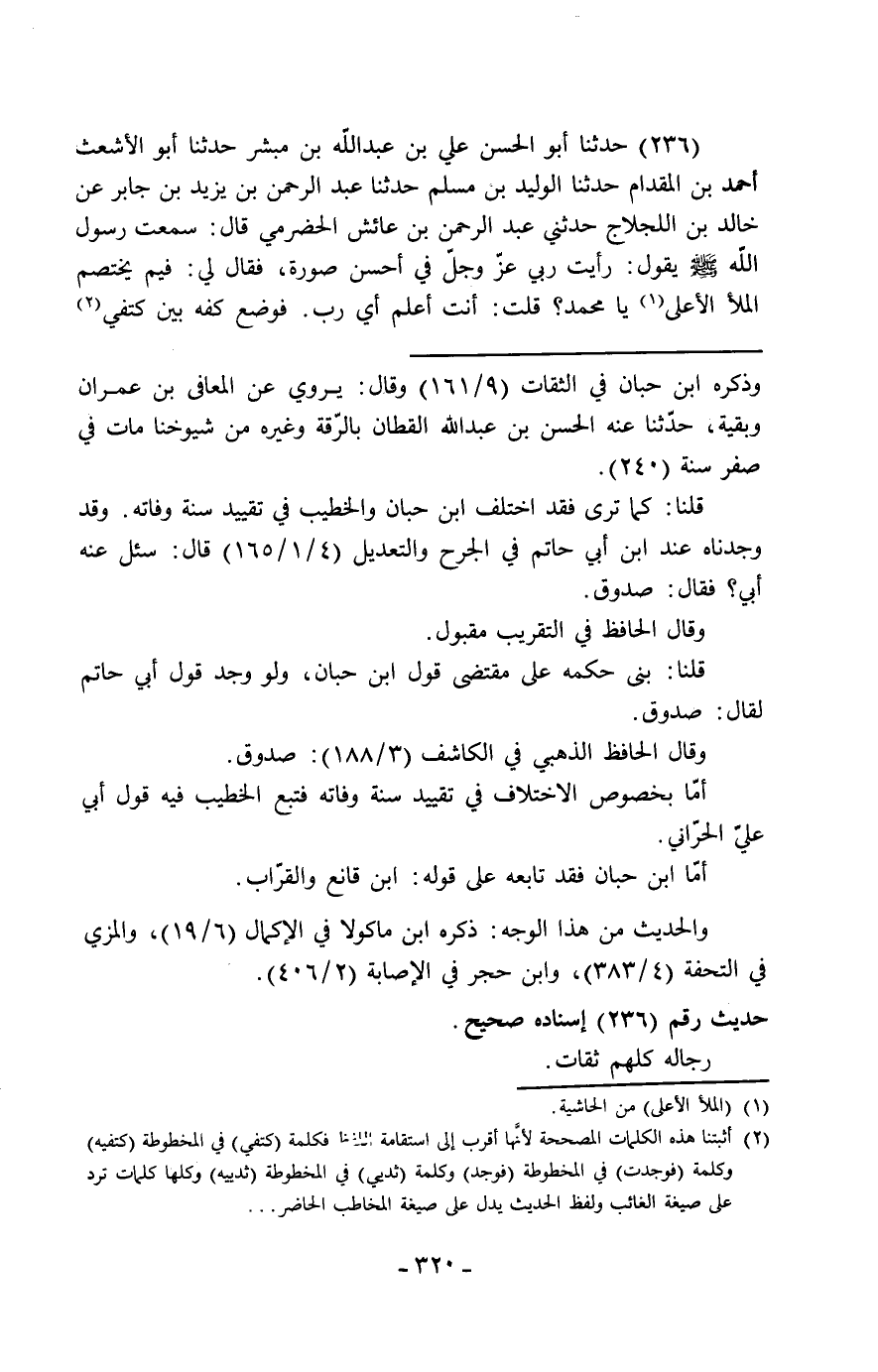 236 - حَدَّثَنَا أَبُو الْحَسَنِ عَلِيُّ بْنُ عَبْدِ اللَّهِ بْنِ مُبَشِّرٍ، حَدَّثَنَا أَبُو الْأَشْعَثِ أَحْمَدُ بْنُ الْمِقْدَامِ، حَدَّثَنَا الْوَلِيدُ بْنُ مُسْلِمٍ، حَدَّثَنَا عَبْدُ الرَّحْمَنِ بْنُ يَزِيدَ بْنِ جَابِرٍ، عَنْ خَالِدِ بْنِ اللَّجْلَاجِ، حَدَّثَنِي عَبْدُ الرَّحْمَنِ بْنُ عَائِشٍ الْحَضْرَمِيُّ، قَالَ: سَمِعْتُ رَسُولَ اللَّهِ صَلَّى اللَّهُ عَلَيْهِ وَسَلَّمَ يَقُولُ: " §رَأَيْتُ رَبِّي عَزَّ وَجَلَّ فِي أَحْسَنِ صُورَةٍ، فَقَالَ لِي: فِيمَ يَخْتَصِمُ الْمَلَأُ الْأَعْلَى يَا مُحَمَّدُ؟ قُلْتُ: أَنْتَ أَعْلَمُ أَيْ رَبِّ، فَوَضَعَ كَفَّهُ بَيْنَ كَتِفَيَّ، -[321]- فَوَجَدْتُ بَرْدَهَا بَيْنَ ثَدْيَيَّ، قَالَ: فَعَلِمْتُ مَا فِي السَّمَاءِ وَالْأَرْضِ، ثُمَّ تَلَا: {وَكَذَلِكَ نُرِي إِبْرَاهِيمَ مَلَكُوتَ السَّمَوَاتِ وَالْأَرْضِ وَلِيَكُونَ مِنَ الْمُوقِنِينَ} ، ثُمَّ قَالَ: فِيمَ يَخْتَصِمُ الْمَلَأُ الْأَعْلَى يَا مُحَمَّدُ؟ قُلْتُ: فِي الْكَفَّارَاتِ، قَالَ: وَمَا الْكَفَّارَاتُ؟ قُلْتُ: الْمَشْيُ إِلَى الْجُمُعَاتِ، وَانْتِظَارُ الصَّلَاةِ بَعْدَ الصَّلَوَاتِ، وَالْجُلُوسُ فِي الْمَسَاجِدِ، وَانْتِظَارُ الصَّلَاةِ بَعْدَ الصَّلَوَاتِ، وَإِسْبَاغُ الْوُضُوءِ عَلَى الْمَكَارِهِ، فَقَالَ اللَّهُ عَزَّ وَجَلَّ: مَنْ يَفْعَلْ ذَلِكَ يَعِشْ بِخَيْرٍ، وَيَمُتْ بِخَيْرٍ، وَيَكُونُ مِنْ خَطِيئَتِهِ كَيَوْمِ وَلَدَتْهُ أُمُّهُ، قَالَ: وَمِنَ الدَّرَجَاتِ إِطْعَامُ الطَّعَامِ، وَطِيبُ الْكَلَامِ، وَأَنْ تَقُومَ بِاللَّيْلِ وَالنَّاسُ نِيَامٌ، قُلِ: اللَّهُمَّ إِنِّي أَسْأَلُكَ الطَّيِّبَاتِ، وَتَرْكَ الْمُنْكَرَاتِ، وَحُبَّ الْمَسَاكِينِ، وَأَنْ تَغْفِرَ لِي وَتَرْحَمَنِي، وَإِذَا أَرَدْتَ فِتْنَةً فِي قَوْمٍ فَتَوَفَّنِي غَيْرَ مَفْتُونٍ ". قَالَ: قَالَ رَسُولُ اللَّهِ صَلَّى اللَّهُ عَلَيْهِ وَسَلَّمَ: «تَعَلَّمُوهُنَّ؛ فَوَالَّذِي نَفْسِي بِيَدِهِ إِنَّهُنَّ لَحَقٌّ»