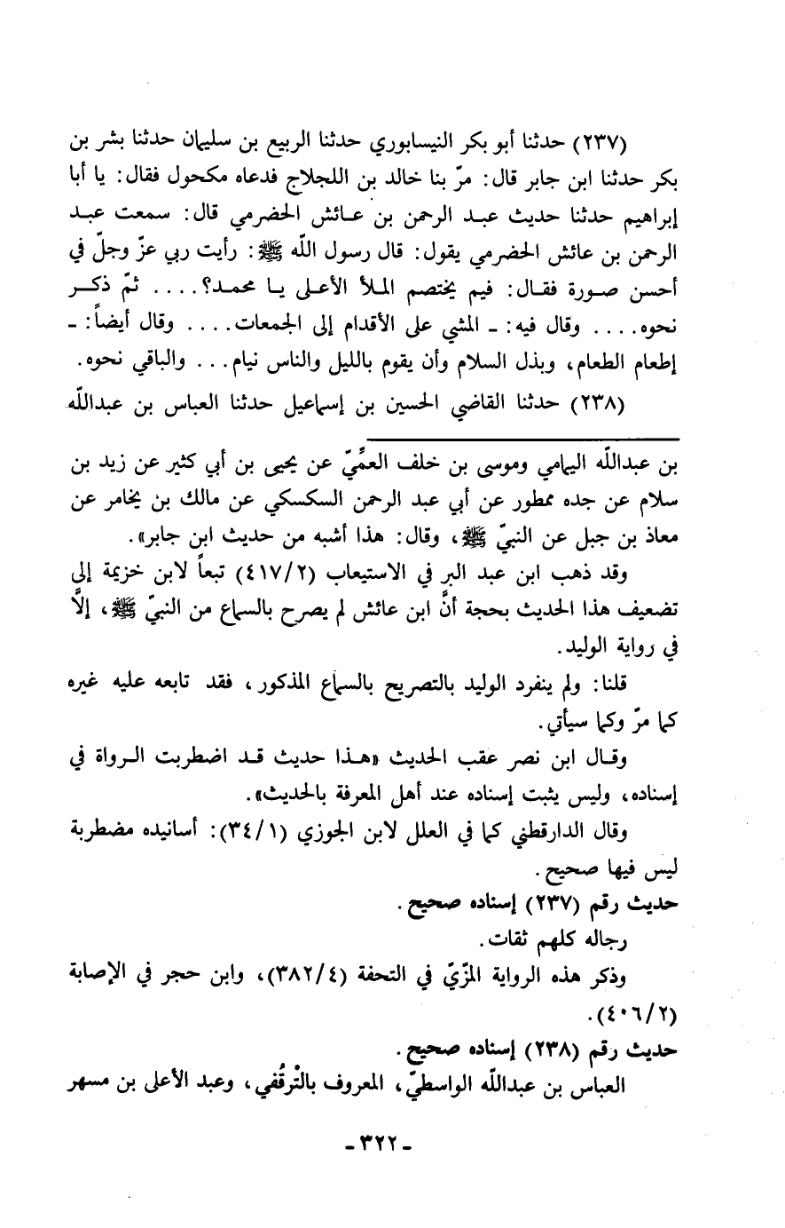 237 - حَدَّثَنَا أَبُو بَكْرٍ النَّيْسَابُورِيُّ، حَدَّثَنَا الرَّبِيعُ بْنُ سُلَيْمَانَ، حَدَّثَنَا بِشْرُ بْنُ بَكْرٍ، حَدَّثَنَا ابْنُ جَابِرٍ، قَالَ: مَرَّ بِنَا خَالِدُ بْنُ اللَّجْلَاجِ، فَدَعَاهُ مَكْحُولٌ، فَقَالَ: يَا أَبَا إِبْرَاهِيمَ، حَدِّثْنَا حَدِيثَ عَبْدِ الرَّحْمَنِ بْنِ عَائِشٍ الْحَضْرَمِيِّ، قَالَ: سَمِعْتُ عَبْدَ الرَّحْمَنِ بْنَ عَائِشٍ الْحَضْرَمِيَّ، يَقُولُ: قَالَ رَسُولُ اللَّهِ صَلَّى اللَّهُ عَلَيْهِ وَسَلَّمَ: " §رَأَيْتُ رَبِّي عَزَّ وَجَلَّ فِي أَحْسَنِ صُورَةٍ، فَقَالَ: فِيمَ يَخْتَصِمُ الْمَلَأُ الْأَعْلَى يَا مُحَمَّدُ؟ " ثُمَّ ذَكَرَ نَحْوَهُ وَقَالَ فِيهِ: «الْمَشْيُ عَلَى الْأَقْدَامِ إِلَى الْجُمُعَاتِ» ، وَقَالَ أَيْضًا: «إِطْعَامُ الطَّعَامِ، وَبَذْلُ السَّلَامِ، وَأَنْ يَقُومَ بِاللَّيْلِ وَالنَّاسُ نِيَامٌ» وَالْبَاقِي نَحْوَهُ