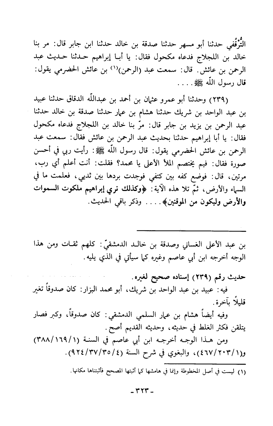 239 - وَحَدَّثَنَا أَبُو عَمْرٍو عُثْمَانُ بْنُ أَحْمَدَ بْنِ عَبْدِ اللَّهِ الدَّقَّاقُ، حَدَّثَنَا عُبَيْدُ بْنُ عَبْدِ الْوَاحِدِ بْنِ شَرِيكٍ، حَدَّثَنَا هِشَامُ بْنُ عَمَّارٍ، حَدَّثَنَا صَدَقَةُ بْنُ خَالِدٍ، حَدَّثَنَا عَبْدُ الرَّحْمَنِ بْنُ يَزِيدَ بْنِ جَابِرٍ، قَالَ: مَرَّ بِنَا خَالِدُ بْنُ اللَّجْلَاجِ، فَدَعَاهُ مَكْحُولٌ فَقَالَ: يَا أَبَا إِبْرَاهِيمَ، حَدِّثْنَا بِحَدِيثِ عَبْدِ الرَّحْمَنِ بْنِ عَائِشٍ، فَقَالَ: سَمِعْتُ عَبْدَ الرَّحْمَنِ بْنَ عَائِشٍ الْحَضْرَمِيَّ، يَقُولُ: قَالَ رَسُولُ اللَّهِ صَلَّى اللَّهُ عَلَيْهِ وَسَلَّمَ: " §رَأَيْتُ رَبِّي فِي أَحْسَنِ صُورَةٍ، فَقَالَ: فِيمَ يَخْتَصِمُ الْمَلَأُ الْأَعْلَى يَا مُحَمَّدُ؟ فَقُلْتُ: أَنْتَ أَعْلَمُ أَيْ رَبِّ، مَرَّتَيْنِ، قَالَ: فَوَضَعَ كَفَّهُ بَيْنَ كَتِفَيَّ، فَوَجَدْتُ بَرْدَهَا بَيْنَ ثَدْيَيَّ، فَعَلِمْتُ مَا فِي السَّمَاءِ وَالْأَرْضِ، ثُمَّ تَلَا هَذِهِ الْآيَةَ: {وَكَذَلِكَ نُرِي إِبْرَاهِيمَ مَلَكُوتَ السَّمَوَاتِ وَالْأَرْضِ وَلِيَكُونَ مِنَ الْمُوقِنِينَ} " وَذَكَرَ بَاقِيَ الْحَدِيثِ