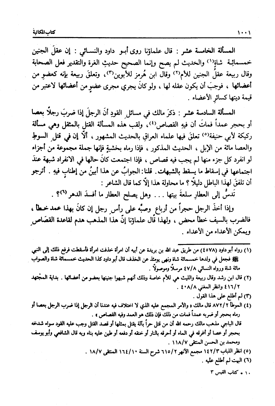 المسألة السادسة عشر: ذكرَ مالك في مسائلِ القودِ أنَّ الرجلَ إذا ضرب رجلاً بعصا أو بحجر عمداً فماتَ أن فيهِ القصاص (¬4)، ولقب هذه المسألة القتل بالمثقل وهي مسألة ركيكة لأبي حنيفة (¬5) تعلقَ فيها علماء العراقِ بالحديث المشهور، إلاَّ إن في قتلِ السوطِ والعصا مائة من الإبل، الحديث المذكور، فإذا رماه بخشبةٍ فإنها جملة مجموعة من أجزاء لو انفرد كل جزء منها لم يجب فيه قصاص، فإذا اجتمعت كانَ حالها في الانفراد شبهة عندَ اجتماعها في إسقاط ما يسقط بالشبهات. قلنا: الجوابُ عن هذا أبينُ من إِطنابٍ فيهِ. أترجو أن تلفقَ لهذا الباطل دليلًا؟ ما محاولة هذا إلاَّ كما قال الشاعر: