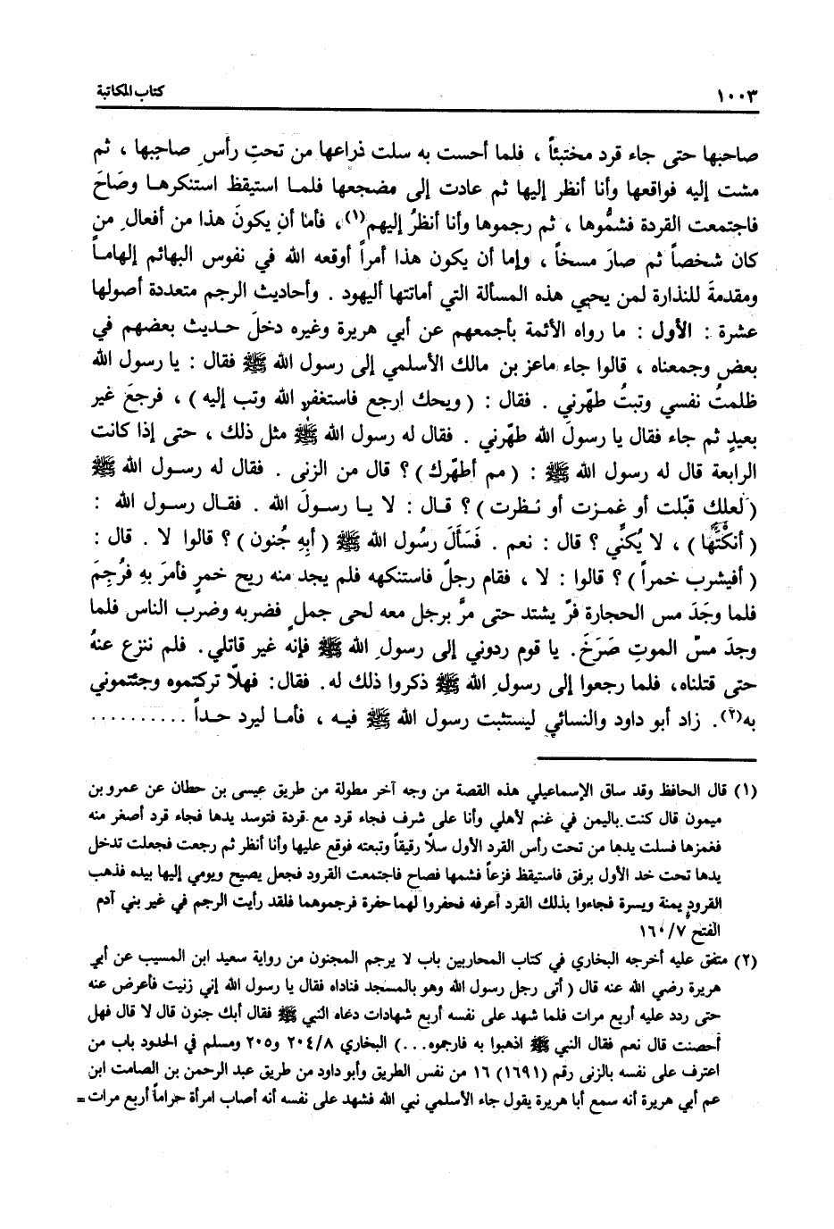 صاحبها حتى جاء قرد مختبئًا، فلما أحست به سلت ذراعها من تحتِ رأسِ صاحبها، ثم مشت إليه فواقعها وأنا أنظر إليها ثم عادت إلى مضجعها فلما استيقظ استنكرها وصَاحَ فاجتمعت القرد فشمُّوها، ثم رجموها وأنا أنظرُ إليهم (¬1)، فأما أن يكونَ هذا من أفعالِ من كان شخصاً ثم صارَ مسخاً، وإما أن يكون هذا أمراً أوقعه الله في نفوس البهائم إلهاماً ومقدمةَ للنذارة لمن يحيي هذه المسألة التي أماتتها اليهود. وأحاديث الرجم متعددة أصولها عشرة: الأول: ما رواه الأئمة بأجمعهم عن أبي هريرة وغيره دخلَ حديث بعضهم في بعض وجمعناه، قالوا جاء ماعز بن مالك الأسلمي إلى رسول الله صلى الله عليه وسلم فقال: يا رسول الله ظلمتُ نفسي وتبتُ طهّرني. فقال: (ويحك ارجع فاستغفر الله وتب إليه)، فرجعَ غير بعيدٍ ثم جاء فقال يا رسولَ الله طهّرني. فقال له رسول الله - صلى الله عليه وسلم - مثل ذلك، حتى إذا كانت الرابعة قال له رسول الله صلى الله عليه وسلم: (مم أطهّرك)؟ قال من الزنى. فقال له رسول الله صلى الله عليه وسلم: (لعلك قبّلت أو غمزت أو نظرت)؟ قال: لا يا رسولَ الله. فقال رسول الله: (أنكْتَها)، لا يُكنِّي؟ قال: نعم. فَسَألَ رسُول الله صلى الله عليه وسلم (أبِهِ جُنون)؟ قالوا لا. قال: (أفيشرب خمراً)؟ قالوا: لا، فقام رجلٌ فاستنكهه فلم يجد منه ريح خمرٍ فأمرَ بهِ فرُجِمَ فلما وجَدَ مس الحجارة فرّ يشتد حتى مرَّ برجل معه لحى جملٍ فضربه وضرب الناس فلما وجدَ مسَّ الموتِ صَرَخَ. يا قوم ردوني إلى رسولِ الله - صلى الله عليه وسلم - فإنه غير قاتلي. فلم ننزع عنهُ حتى قتلناه، فلما رجعوا إلى رسولِ الله - صلى الله عليه وسلم - ذكروا ذلك له. فقال: فهلَّا تركتموه وجئتموني به (¬2). زاد أبو داود والنسائي ليستثبت رسول الله - صلى الله عليه وسلم - فيه، فأما ليرد حداً ..........
