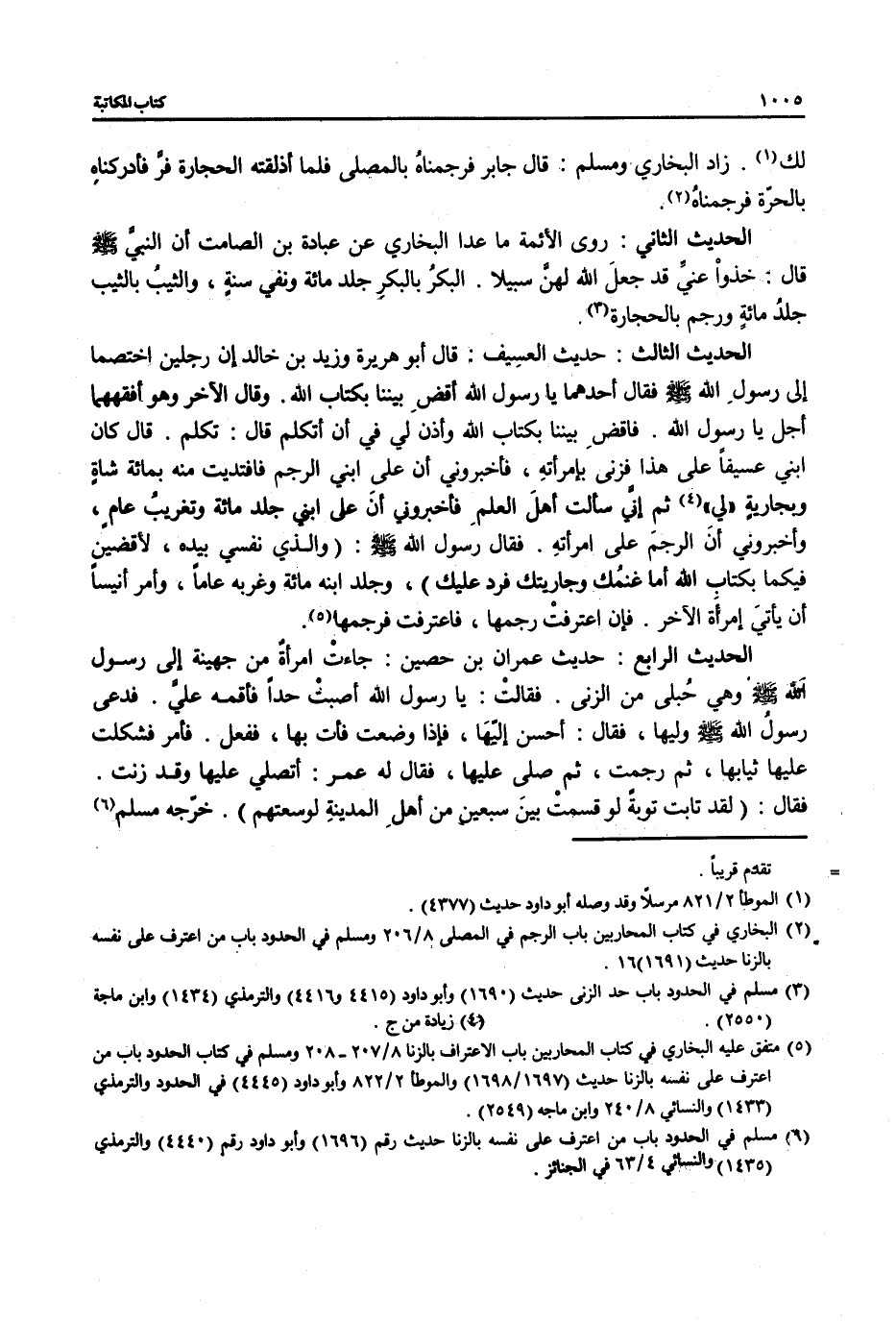 (¬5) متفق عليه البخاري في كتاب المحاربين باب الاعتراف بالزنا 8/ 207 - 208 ومسلم في كتاب الحدود باب من اعترف على نفسه بالزنا حديث (1697/ 1698) والموطأ 2/ 822 وأبو داود (4445) في الحدود والترمذي (1433) والنسائي 8/ 240 وابن ماجه (2549).