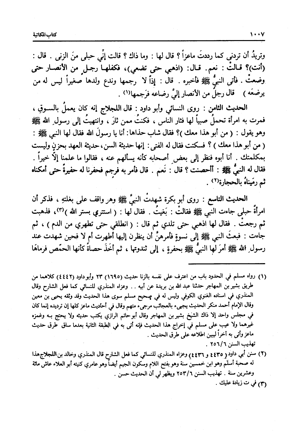 الحديث الثامن: روى النسائي وأبو داود: قال اللجلاج إنه كان يعملُ بالسوقِ، فمرت به امرأة تحملُ صبياً لها فثار الناس، فكنت ممن ثارَ، وانتهيتُ إلى رسولِ الله - صلى الله عليه وسلم - وهو يقول: (من أبو هذا معك)؟ فقال شاب حذاها: أنا يا رسولَ الله فقال لها النبي - صلى الله عليه وسلم -: (من أبو هذا معك)؟ فسكتت فقال له الفتى: إنها حديثة السنن، حديثة العهد بحزنٍ وليست بمكلمتك. أنا أبوه فنظر إلى بعضِ أصحابه كأنه يسألهم عنه، فقالوا ما علمنا إلَّا خيراً. فقال له النبي صلى الله عليه وسلم: أأحصنت؟ قال: نَعم. قال فأمر به فرجم فحفرنا له حفيرةً حتى أمكناه ثم رمَيناهُ بالحجارة (¬2).