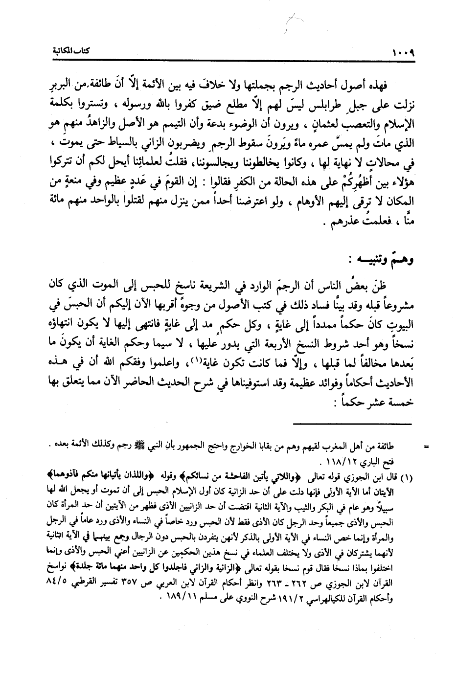 فهذه أصول أحاديث الرجم بجملتها ولا خلافَ فيه بين الأئمة إلَّا أنَّ طائفة، من البربر نزلت على جبلِ طرابلس ليسَ لهم إلَّا مطلع ضيق كفروا بالله ورسوله، وتستروا بكلمة الإِسلام والتعصب لعثمانٍ، ويرون أن الوضوء بدعة وأن التيمم هو الأصل والزاهدُ منهم هو الذي ماتَ ولم يمسّ عمره ماءً وَيرونَ سقوط الرجمِ ويضربون الزاني بالسياط حتى يموت، في محالاتٍ لا نهاية لها، وكانوا يخالطوننا ويجالسوننا، فقلتُ لعلمائِنا أيحل لكم أن تتركوا هؤلاء بين أظهُرِكُمْ على هذه الحالة من الكفرِ فقالوا: إن القومَ في عَددٍ عظيم وفي منعةٍ من المكان لا ترقى إليهم الأوهام، ولو اعترضنا أحداً ممن ينزل منهم لقتلوا بالواحد منهم مائة منَّا، فعلمتُ عذرهم.