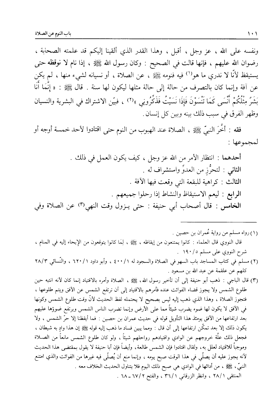 فقه: أخَّرَ النبيّ - صلى الله عليه وسلم -، الصلاة عند الهبوب من النوم حتى اقتادوا لأحد خمسة أوجه أو لمجموعها: