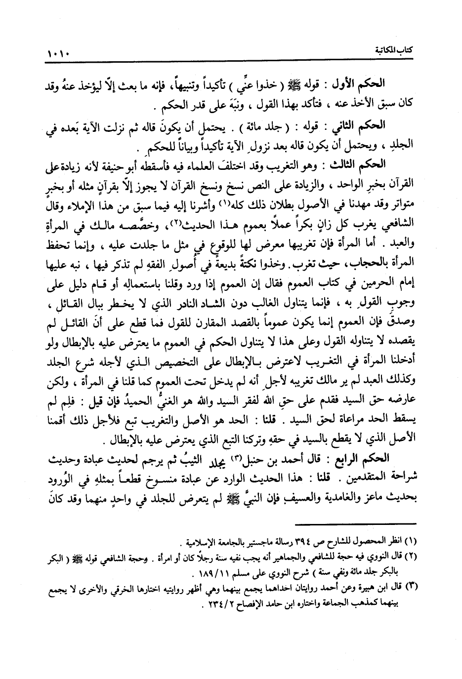 الحكم الرابع: قال أحمد بن حنبل (¬3) يجلد الثيبُ ثم يرجم لحديث عبادة وحديث شراحة المتقدمين. قلنا: هذا الحديث الوارد عن عبادة منسوخ قطعاً بمثلهِ في الوُرود بحديث ماعز والغامدية والعسيف فإن النبيَّ - صلى الله عليه وسلم - لم يتعرض للجلد في واحدٍ منهما وقد كانَ