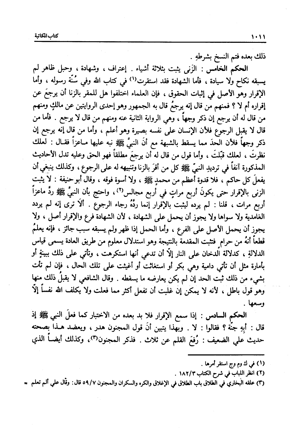 الحكم السادس: إذا سمع الإقرار فلا بد بعده من الاختبار كما فعلَ النبي - صلى الله عليه وسلم - إذ قال: أبِهِ جنة؟ فقالوا: لا. وبهذا يتبين أنَّ قول المجنون هدر، ويعضد هذا بصحته حديث علي الضعيف: رُفعَ القلم عن ثلاث. فذكر المجنون (¬3)، وكذلك أيضاً الذي