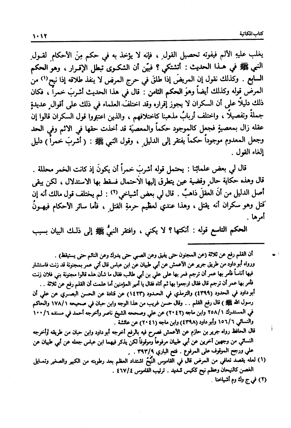 يغلب عليهِ الألم فيفوته تحصيل القولِ، فإنه لا يؤخذ به في حكم مِن الأحكامِ لقولِ النبي - صلى الله عليه وسلم - في هذا الحديث: أتشتكي؟ فبيَّن أن الشكوى تبطل الإقرار، وهو الحكم السابع. وكذلك نقول إن المريض إذا طلق في حرج المرض لا ينفذ طلاقه إذا نيح (¬1) من المرض قوله وكذلك أيضًا وهوَ الحكم الثامن: قال في هذا الحديث أشربَ خمرًا، فكان ذلك دليلاً على أن السكران لا يجوز إقراره وقد اختلقه العلماء في ذلك على أقوالٍ عديدةٍ جملةً وتفصيلاً، واختلف أربابُ مذهبنا كاختلافهم، والذين اعتبروا قول السكران قالوا إن عقله زال بمعصيةٍ فجعل كالموجي حكمًا والمعصية قد أخذت حقها في الإثم وفي الحد وجعل المعدوم موجوداً حكماً يفتقر إلى الدليل، وقول النبي - صلى الله عليه وسلم -: (أشربَ خمرًا) دليل إلغاء القول.