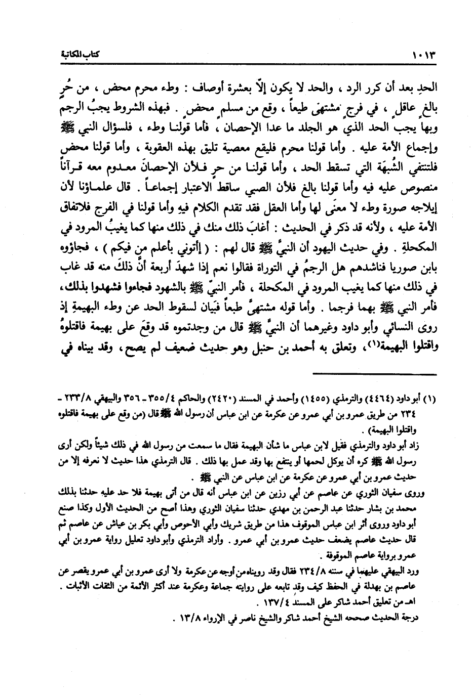 (¬1) أبو داود (4464) والترمذي (1455) وأحمد في المسند (2420) والحاكم 4/ 355 - 356 والبيهقي 8/ 233 - 234 من طريق عمرو بن أبي عمرو عن عكرمة عن ابن عباس أن رسول الله - صلى الله عليه وسلم - قال (من وقع على بهيمة فاقتلوه واقتلوا البهيمة).